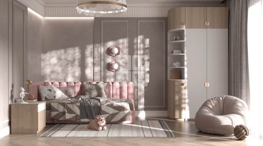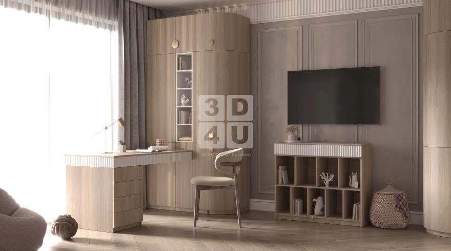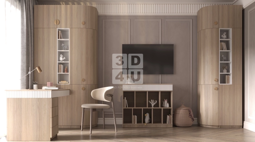 Мы разработали это пространство специально для Renessans — чтобы оно было не просто красивым, а по-настоящему удобным и практичным: письменный стол с встроенными ящиками, эргономичное кресло и настольная лампа — идеальный уголок для учёбы и творчества. Шкаф с плавными изогнутыми формами и круглыми ручками — вместительный, безопасный и стильный. Открытые полки в нише и под ТВ — для книг, игрушек и декора, которые делают комнату живой и личной.