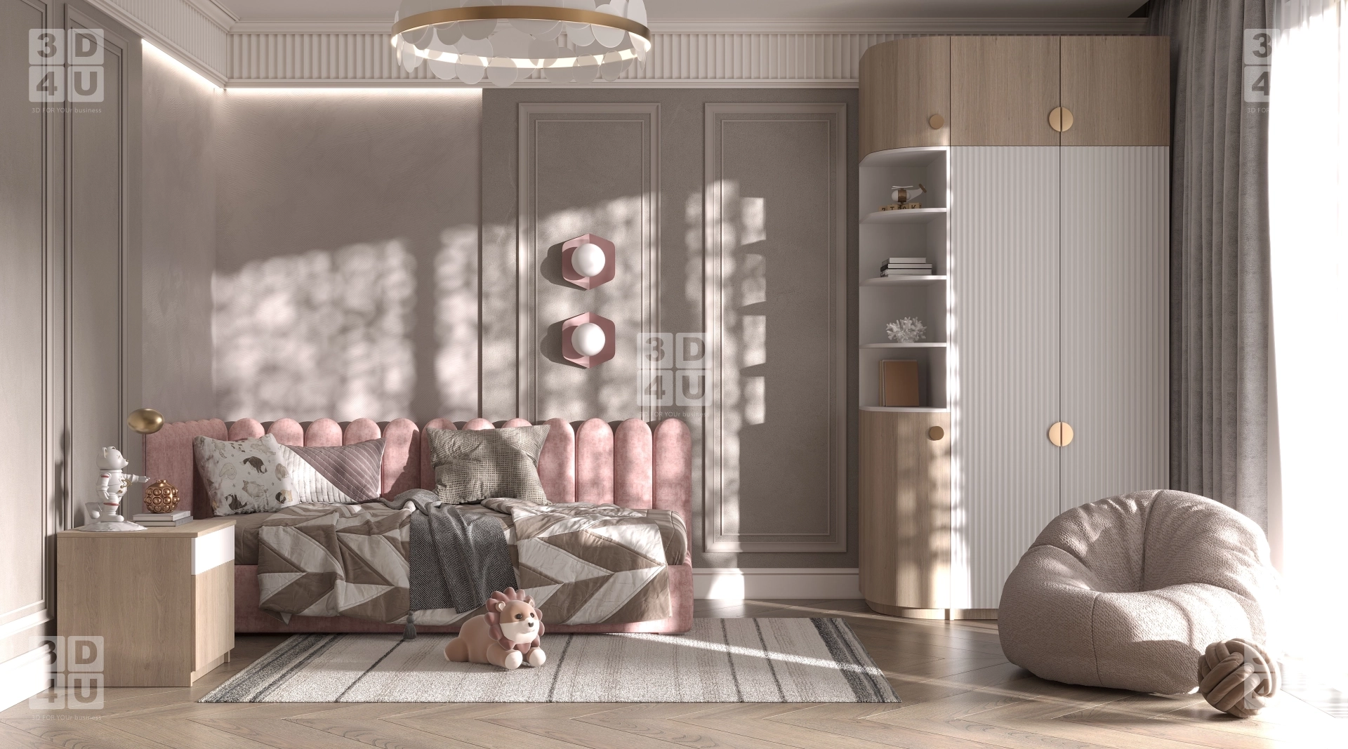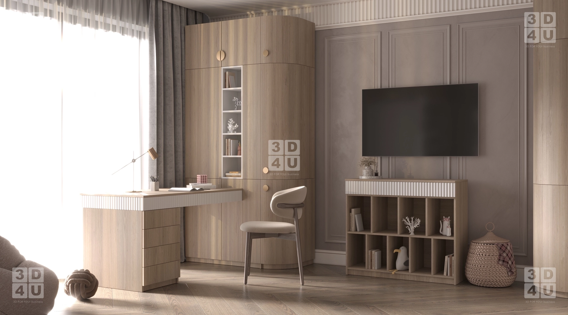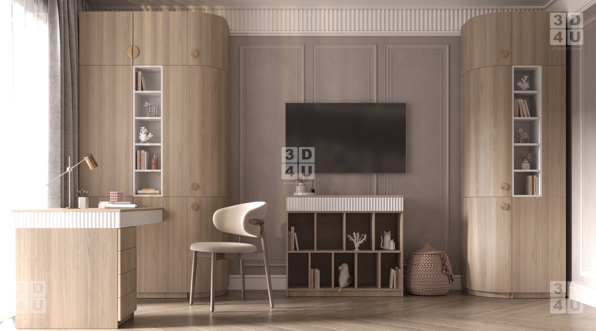 Мы разработали это пространство специально для Renessans — чтобы оно было не просто красивым, а по-настоящему удобным и практичным: письменный стол с встроенными ящиками, эргономичное кресло и настольная лампа — идеальный уголок для учёбы и творчества. Шкаф с плавными изогнутыми формами и круглыми ручками — вместительный, безопасный и стильный. Открытые полки в нише и под ТВ — для книг, игрушек и декора, которые делают комнату живой и личной.