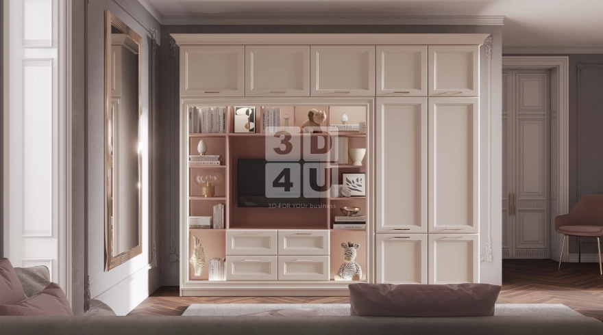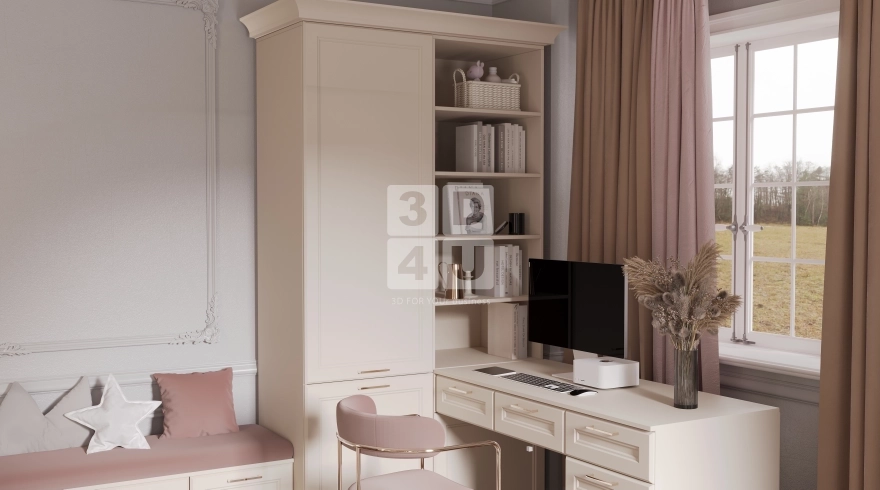 Мы разработали этот интерьер специально для Renessans — чтобы он был не просто красивым, а действительно удобным, практичным и эмоционально тёплым. Центр композиции — вместительный шкаф-стенка в пастельных тонах с лаконичными фасадами и золотистыми ручками. Встроенный телевизор, открытые полки с розовым фоном и ниши для книг, игрушек и декора — всё продумано для жизни: учиться, играть, отдыхать.
