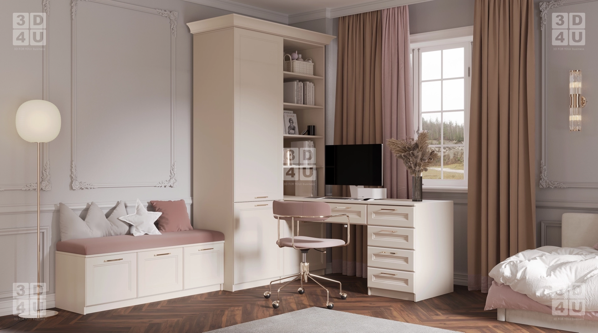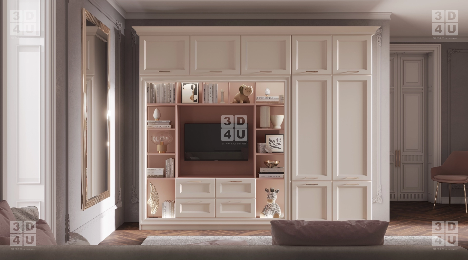 Мы разработали этот интерьер специально для Renessans — чтобы он был не просто красивым, а действительно удобным, практичным и эмоционально тёплым. Центр композиции — вместительный шкаф-стенка в пастельных тонах с лаконичными фасадами и золотистыми ручками. Встроенный телевизор, открытые полки с розовым фоном и ниши для книг, игрушек и декора — всё продумано для жизни: учиться, играть, отдыхать.