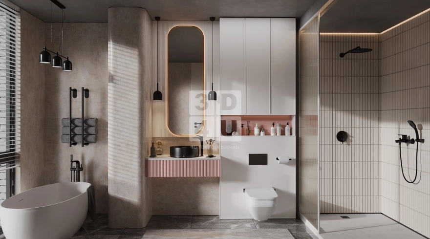 Главная идея проекта — гармония эстетики и функциональности. В интерьере сочетаются светлые тона, нежные розовые акценты и выразительные элементы в графитовом черном, создавая ощущение спокойствия и современного стиля. Эргономичное зонирование, использование влагостойких материалов и интегрированное освещение обеспечивают максимальный комфорт и долговечность.