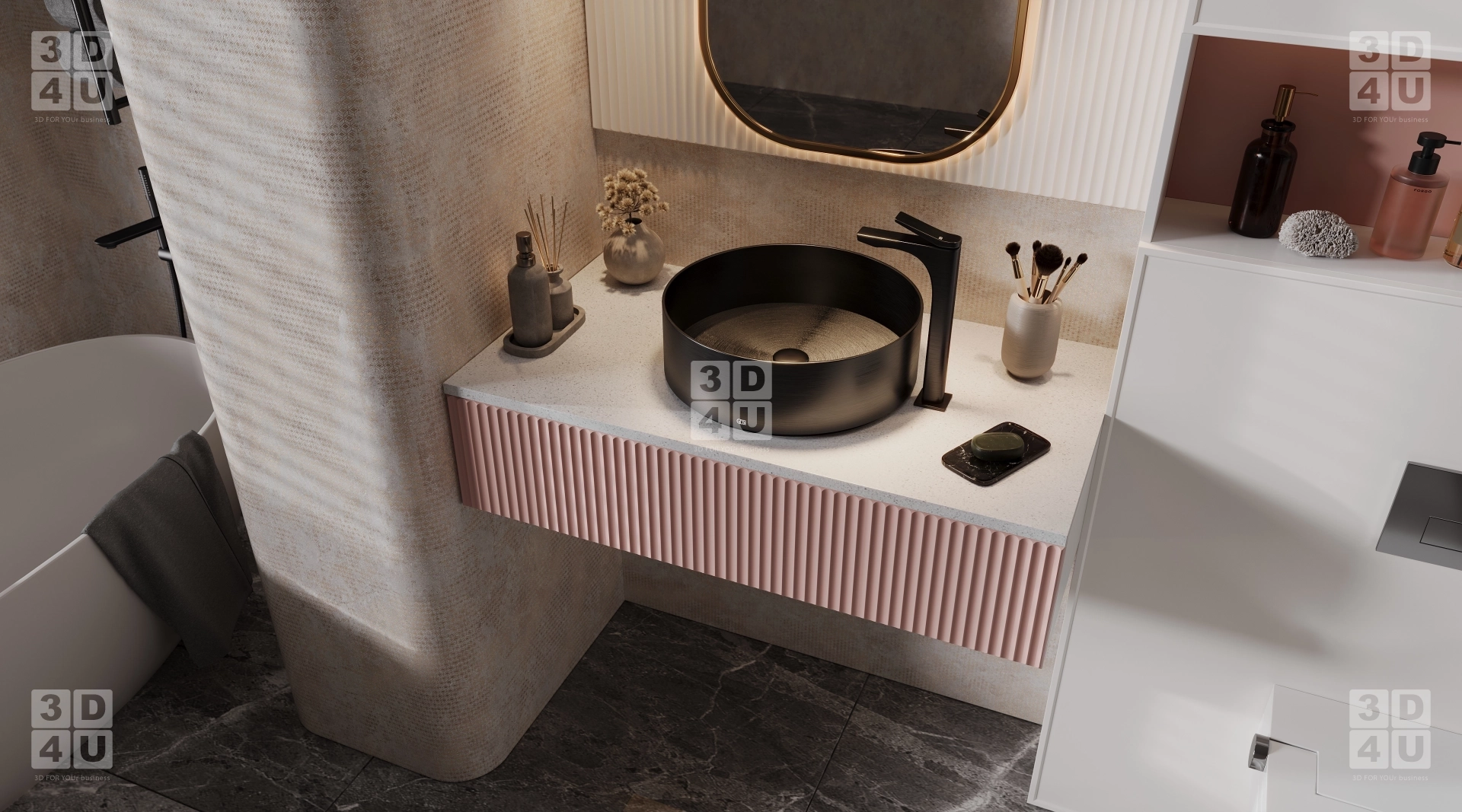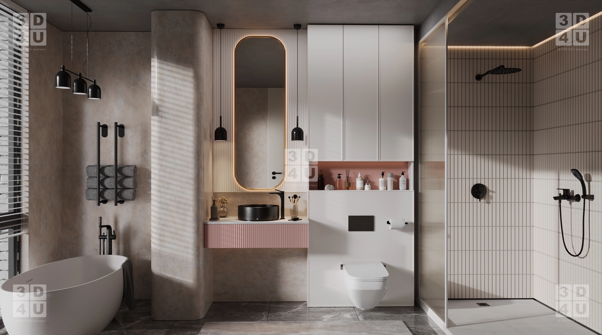 Главная идея проекта — гармония эстетики и функциональности. В интерьере сочетаются светлые тона, нежные розовые акценты и выразительные элементы в графитовом черном, создавая ощущение спокойствия и современного стиля. Эргономичное зонирование, использование влагостойких материалов и интегрированное освещение обеспечивают максимальный комфорт и долговечность.