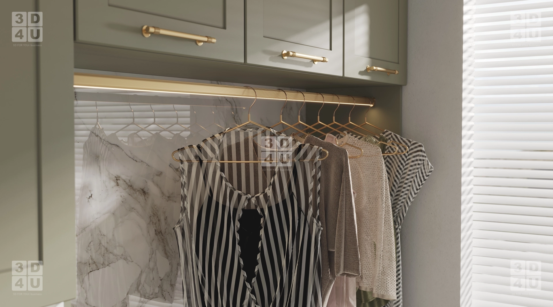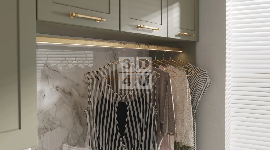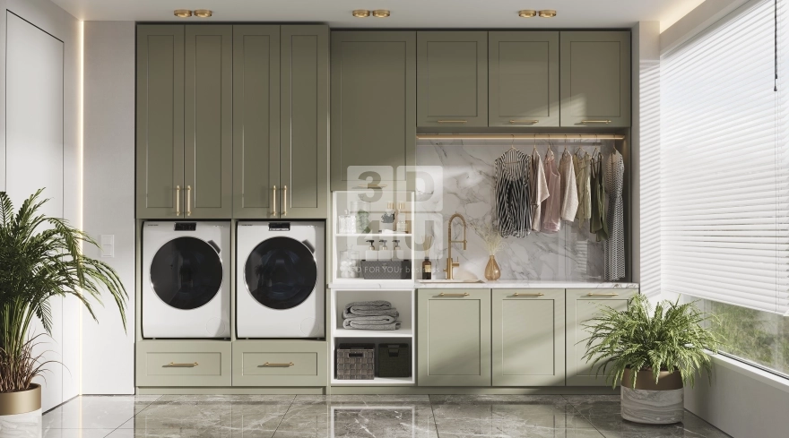Зелёные фасады с классическим профилем и золотыми ручками задают тон всей композиции. Встроенная стиральная и сушильная машины аккуратно скрыты за фасадами, а открытые полки с плетёными корзинами и мраморная столешница с золотым смесителем добавляют практичности и эстетики. Шкаф для одежды с внутренней подсветкой, живые растения и мягкий свет светодиодной ленты создают ощущение уюта и порядка.