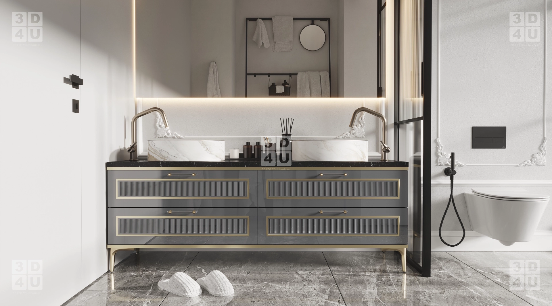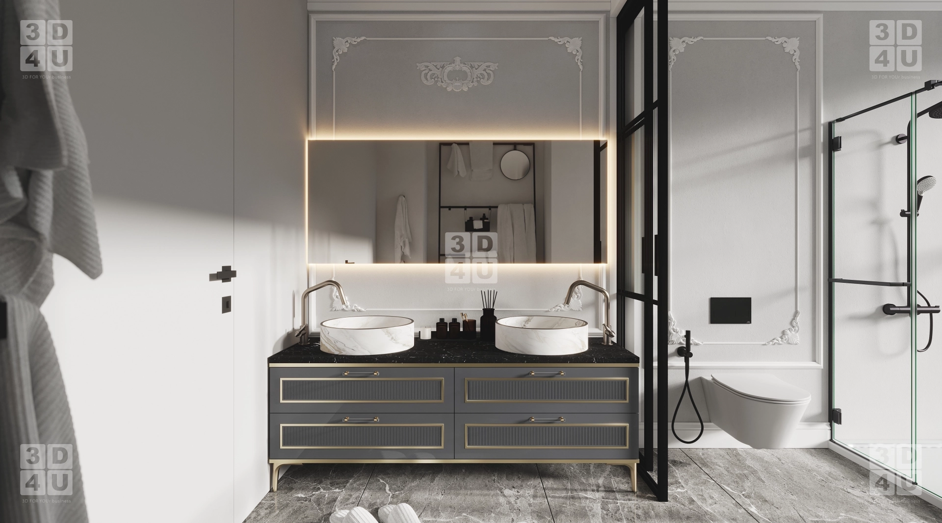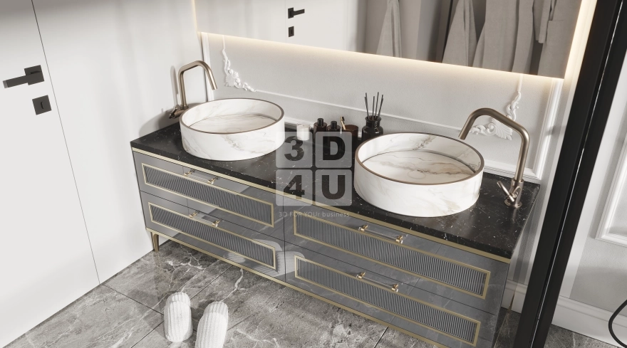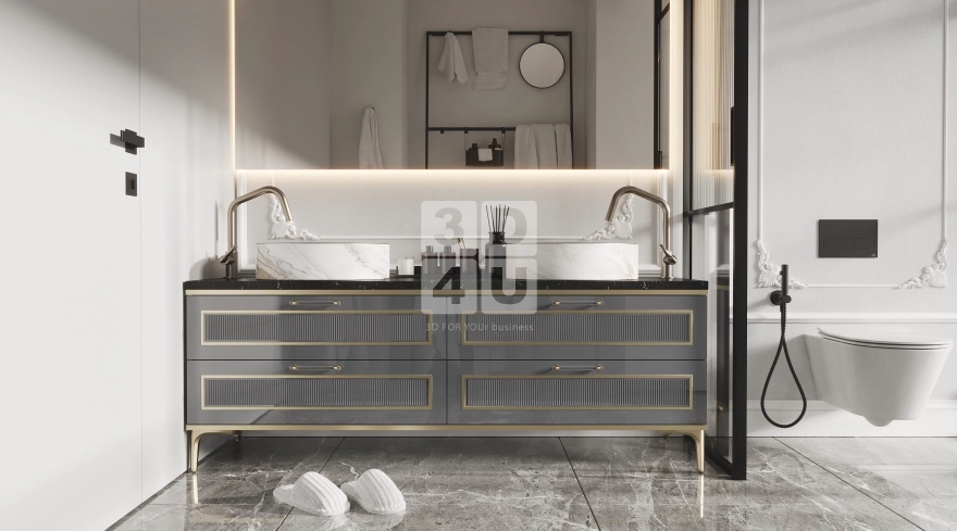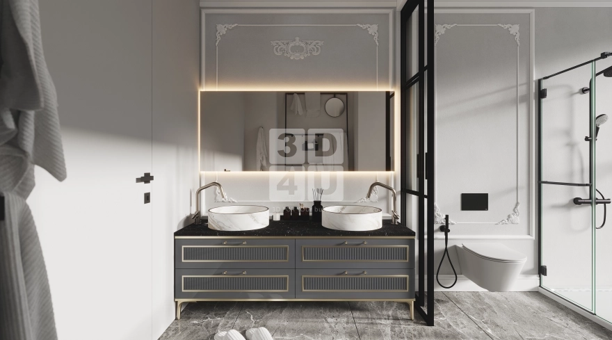 Это пространство мы создали специально для Renessans, чтобы каждый элемент способствовал комфорту, эстетике и ощущению безупречного стиля. Центром композиции является двойная тумба с чёрной мраморной столешницей и белыми раковинами-чашами. Её дополняют золотистые акценты и декоративные фасады с рифлением. Зеркало с подсветкой и лепниной по периметру добавляет нотку шарма, а чёрные рамы душевой и унитаза придают контраста и современного звучания.