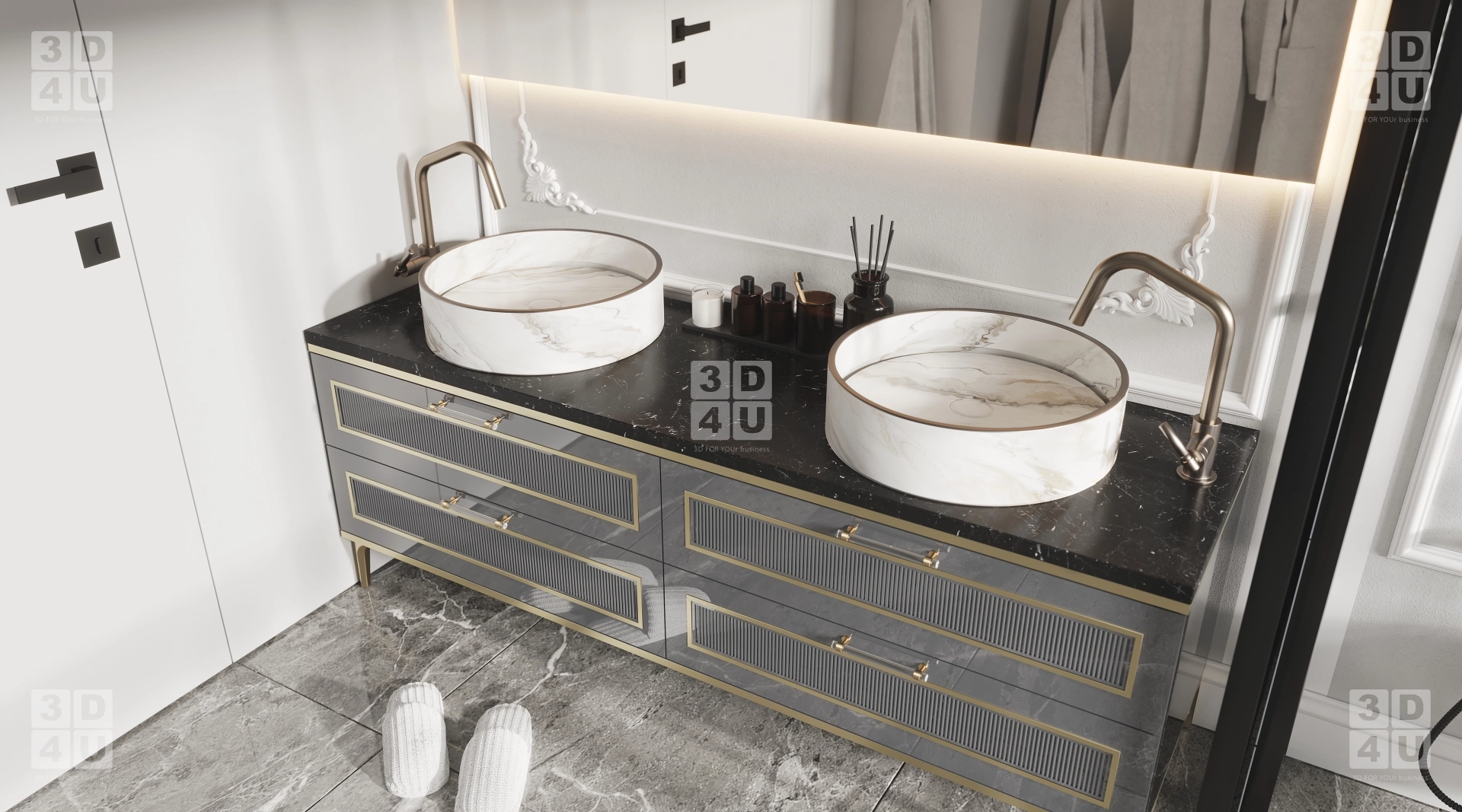 Светлые стены с объёмной лепниной и пол из серого мрамора создают атмосферу спокойствия и роскоши. Здесь нет ничего лишнего — только то, что необходимо для идеального утра и расслабляющего вечера.