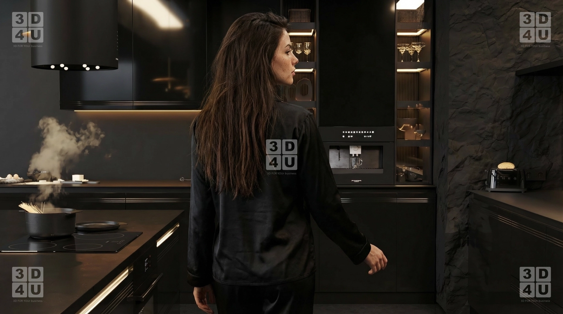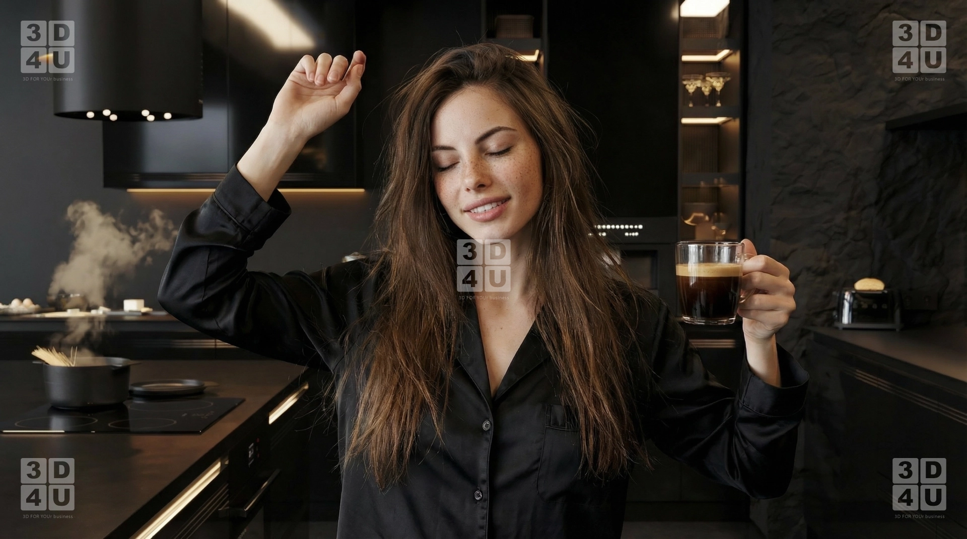 Сначала мы детально проработали идею — момент утреннего ритуала. Для точного попадания в эстетику и настроение использовали генерацию изображений через нейросети. Созданная нейросетями видео-основа получила многослойное и современное звуковое оформление, усиливающее общее впечатление. В финале наша команда выполнила полную сборку, склейку и цветокоррекцию, чтобы итоговый ролик работал безупречно в пространстве шоу-рума, захватывая внимание и передавая уникальный характер материала.