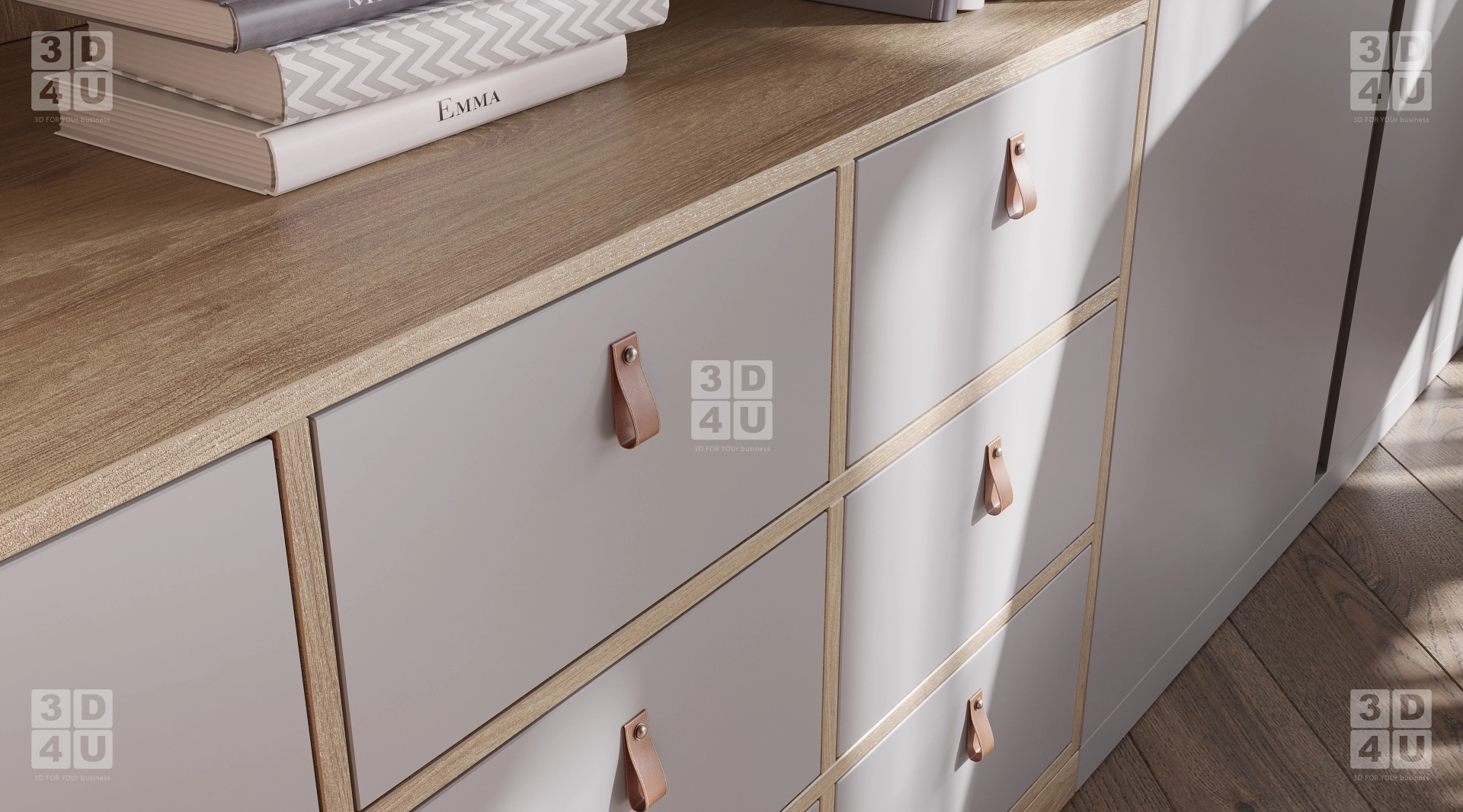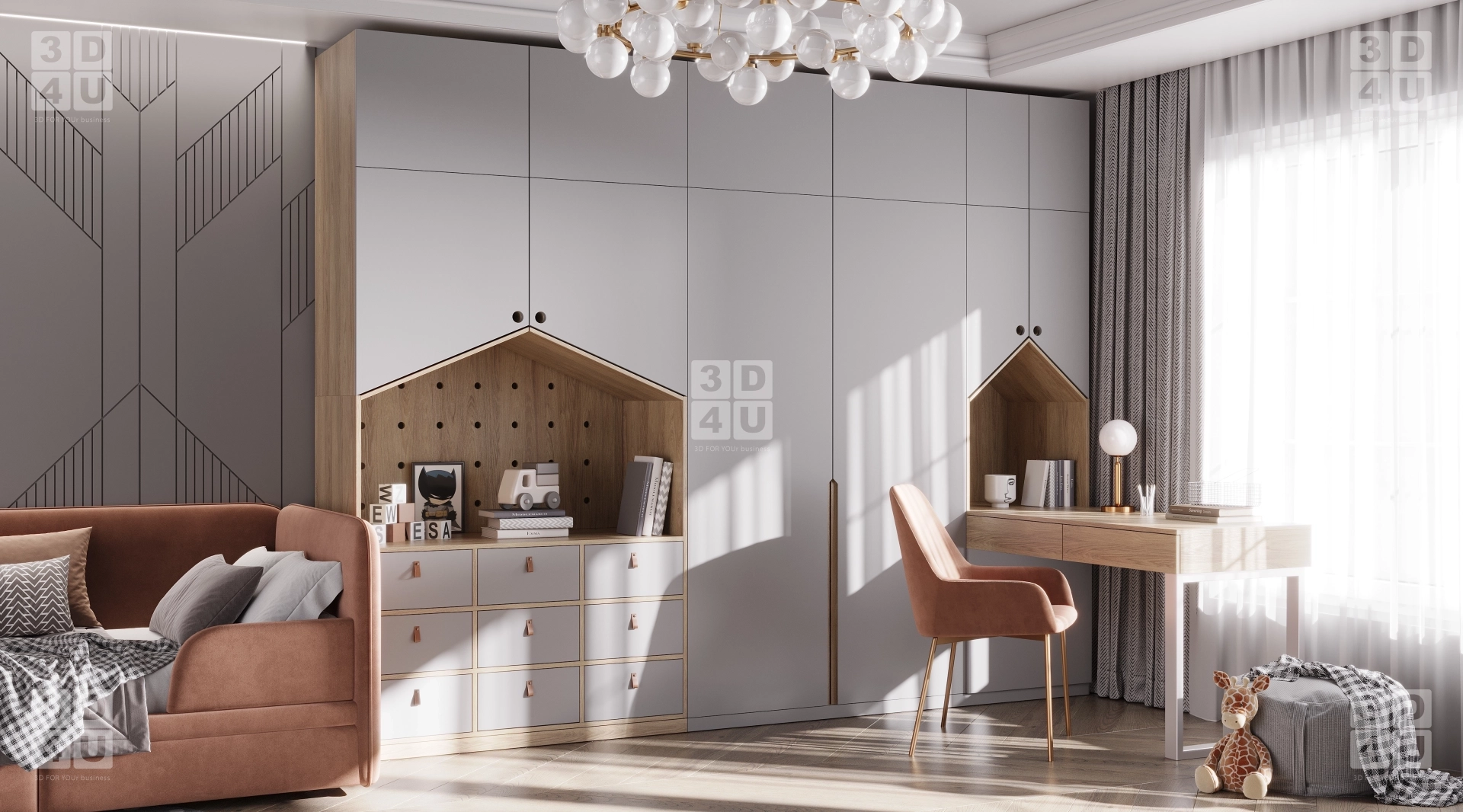 Этот интерьер создан специально для Renessans, чтобы быть не только стильным, но и максимально функциональным. Вместительный шкаф-стенка в серых тонах с деревянными элементами в виде домиков идеально подходит для хранения игрушек, книг и одежды. Открытые полки и ящики с тканевыми ручками не только практичны, но и эстетичны. Зона для работы с письменным столом, удобным креслом и настольной лампой продумана для учёбы и творчества.