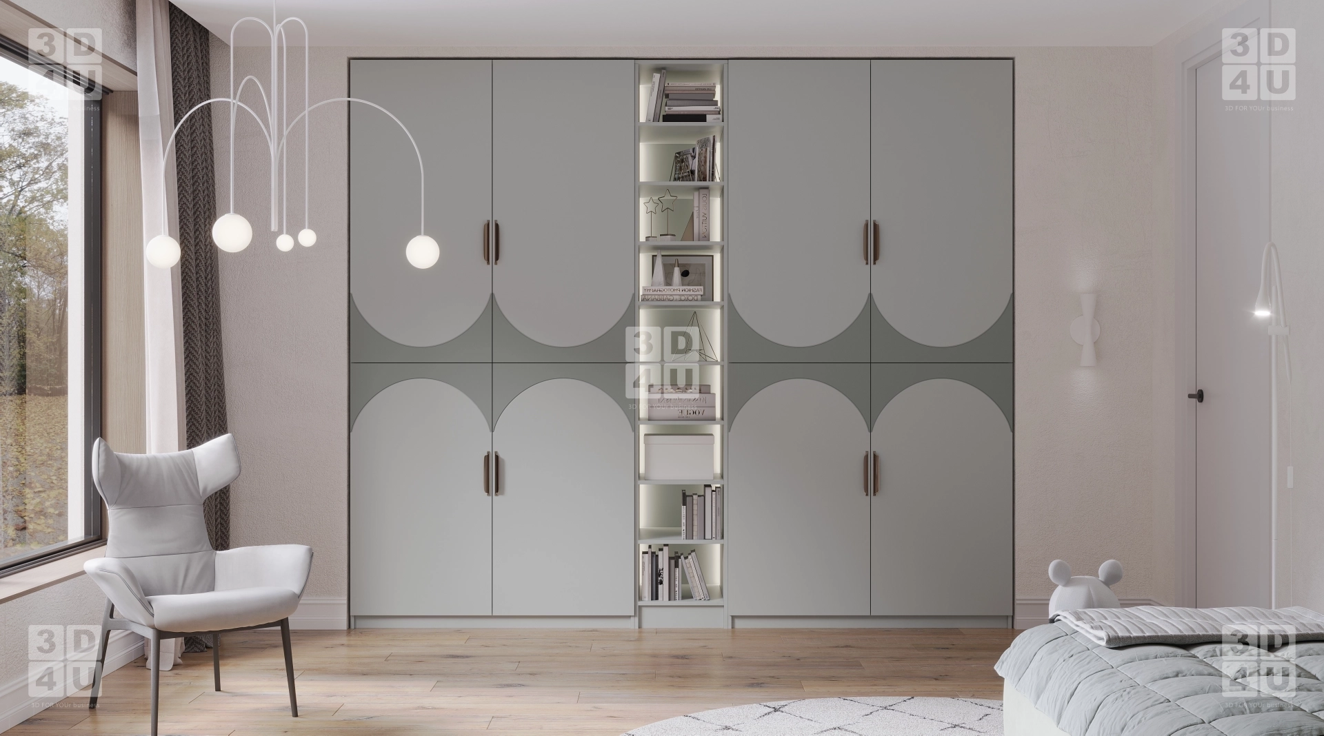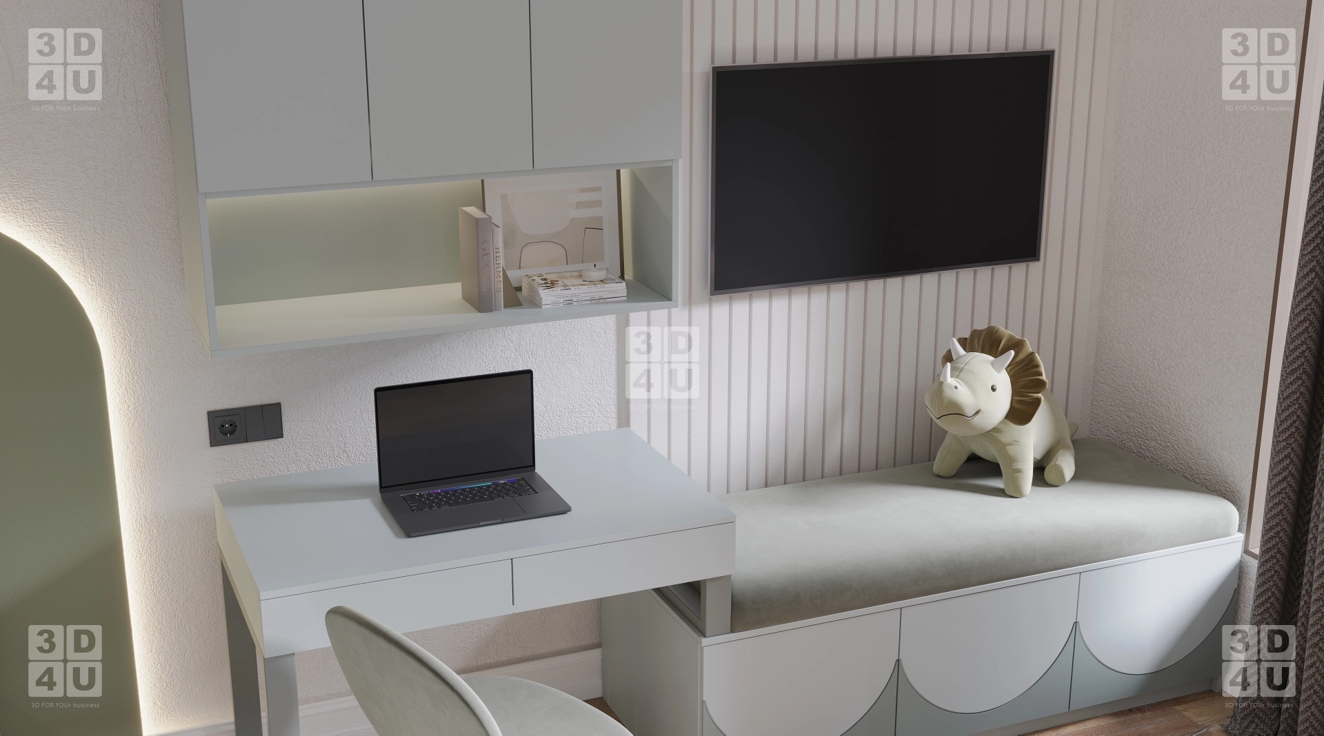 Мы создали это пространство специально для Renessans, чтобы оно было не только красивым, но и максимально удобным, безопасным и уютным. Центром композиции является кровать с мягким изголовьем и арками на стене, украшенными подсветкой. Это не просто место для сна, а настоящий уголок для сновидений и фантазий. Рабочая зона с письменным столом, ноутбуком и эргономичным стулом продумана до мелочей, чтобы обеспечить комфорт для учёбы и творческих занятий. Встроенный шкаф с оригинальными фасадами и вместительными полками не только функционален, но и визуально лёгок.
