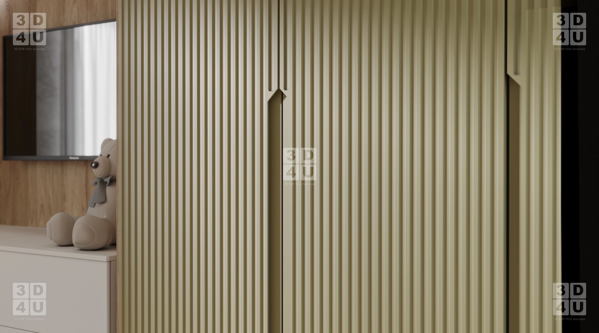 Тёплый оттенок дерева, мягкие бежевые и зелёные тона, текстурированные панели и современное освещение — всё это создаёт гармоничную, спокойную и вдохновляющую атмосферу. Даже игрушка KAWS на полке — часть общего стиля, а не случайность.