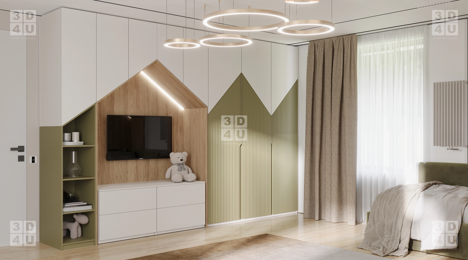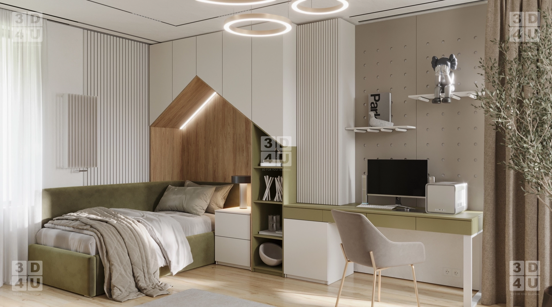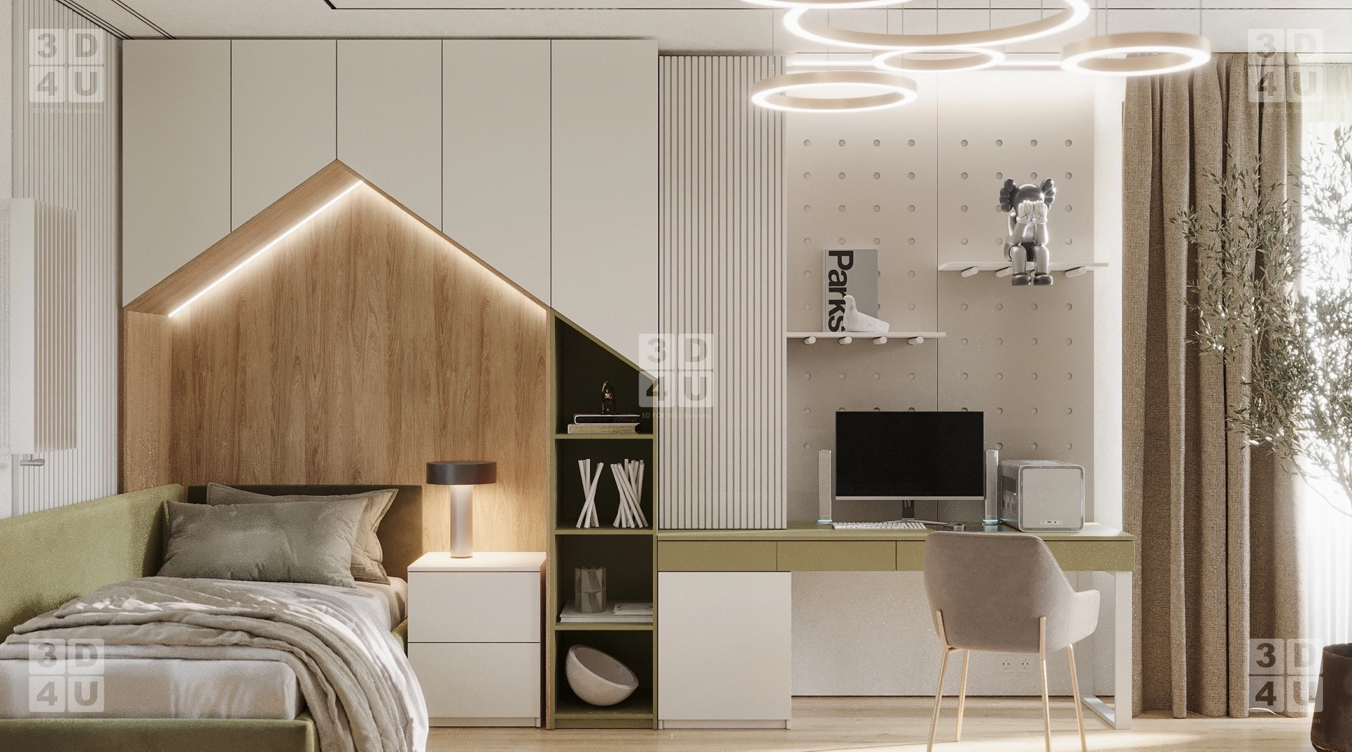 Мы разработали это пространство специально для Renessans — чтобы оно было не просто красивым, а по-настоящему функциональным: кровать с оригинальным изголовьем в форме домика, подсвеченным светодиодной лентой, создаёт атмосферу уюта и безопасности. Рабочая зона с письменным столом, эргономичным креслом и системой хранения — идеально организована для учёбы и творчества. Стенд с перфорацией и модульными полками — гибкое решение для книг, игрушек и коллекций.