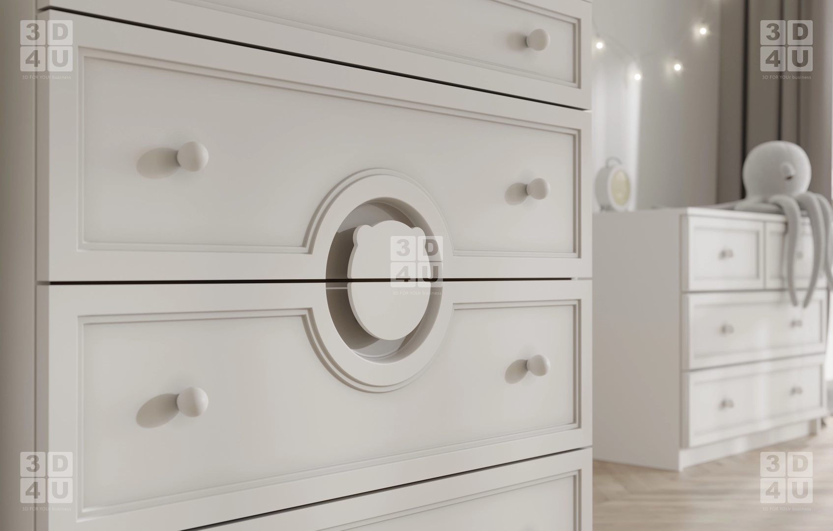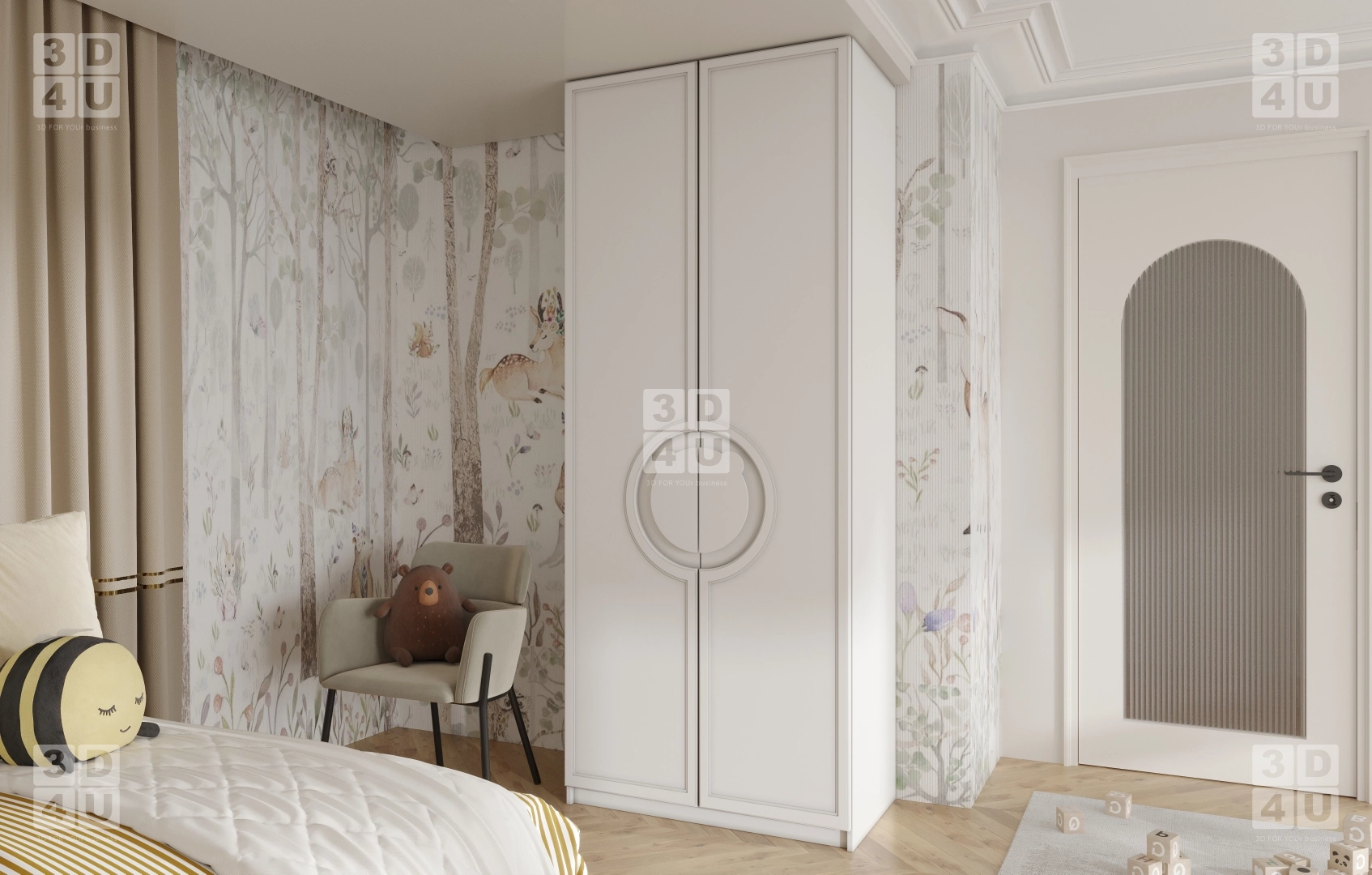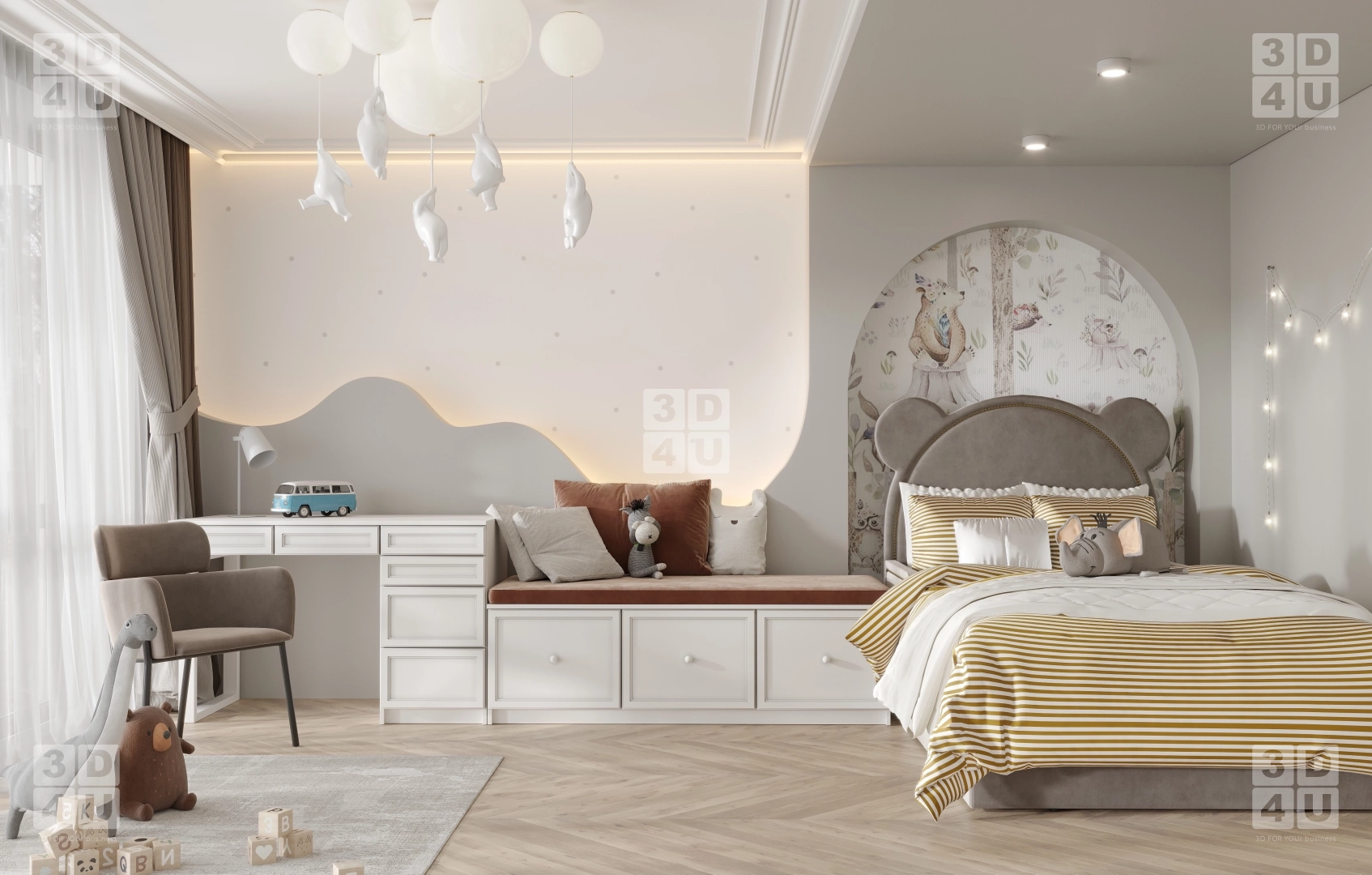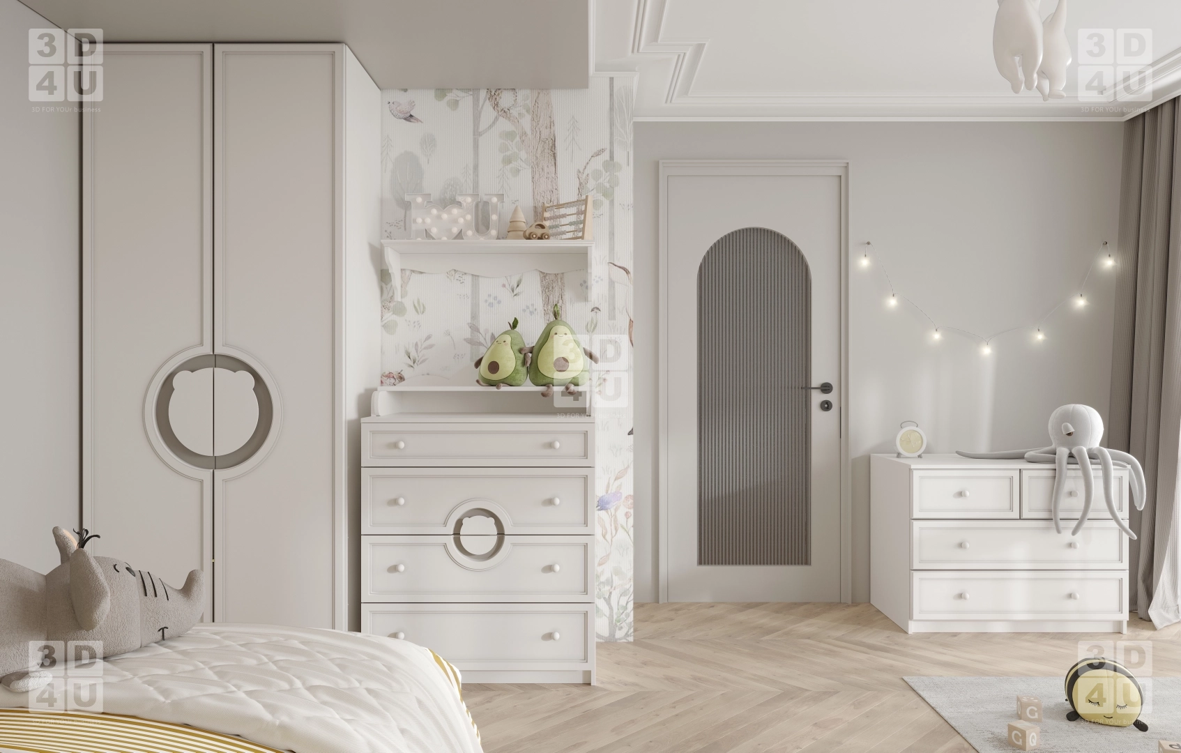 Мы создали это пространство специально для Renessans, чтобы оно было не только красивым, но и тщательно продуманным. В нём есть всё: от шкафа с милым медвежонком-ручкой до комода с полками для игрушек и косметики. Лесной принт на стене и мягкий свет гирлянд создают сказочную атмосферу, а паркет с диагональной укладкой и белая мебель придают интерьеру чистоту и гармонию.