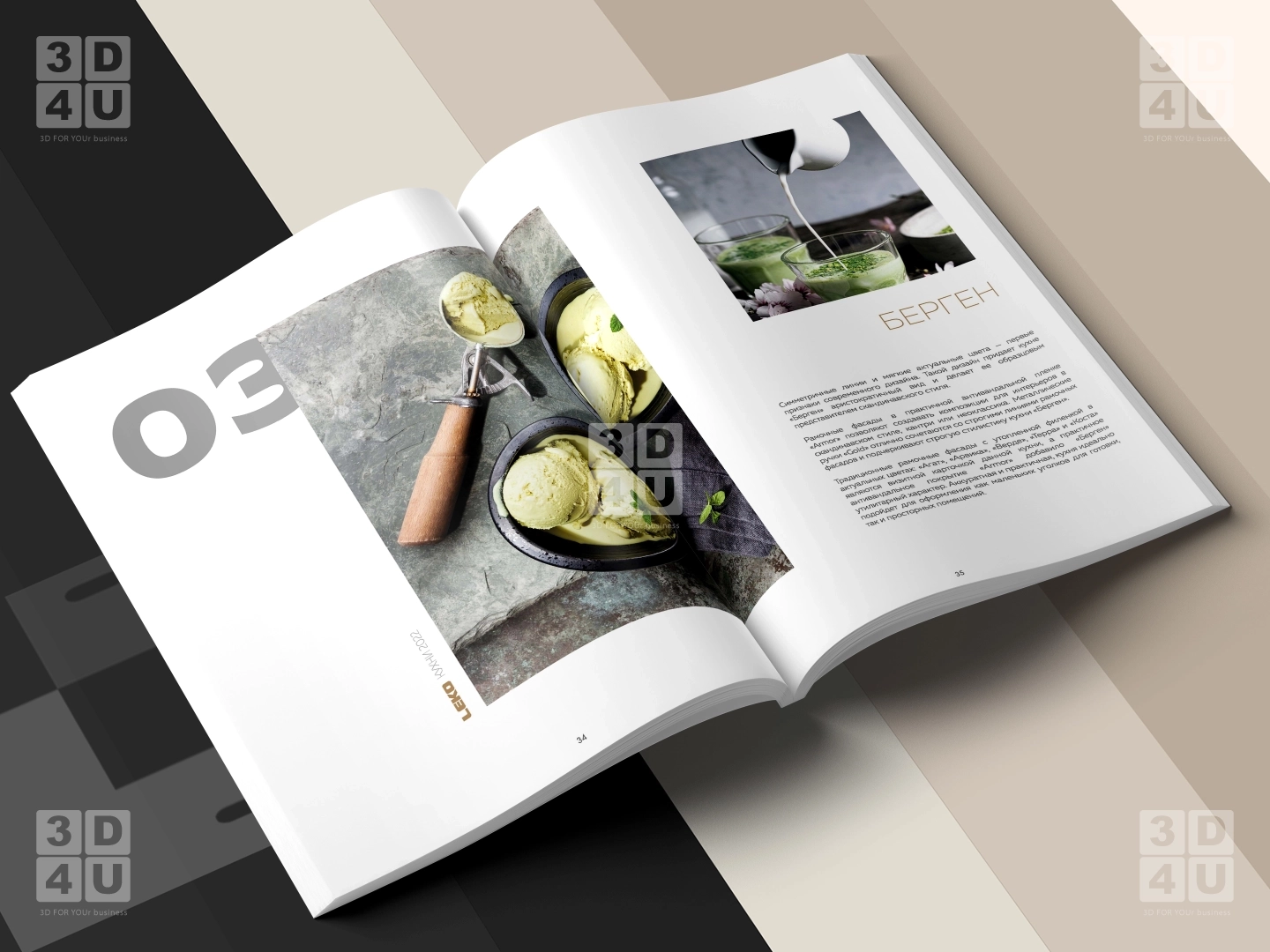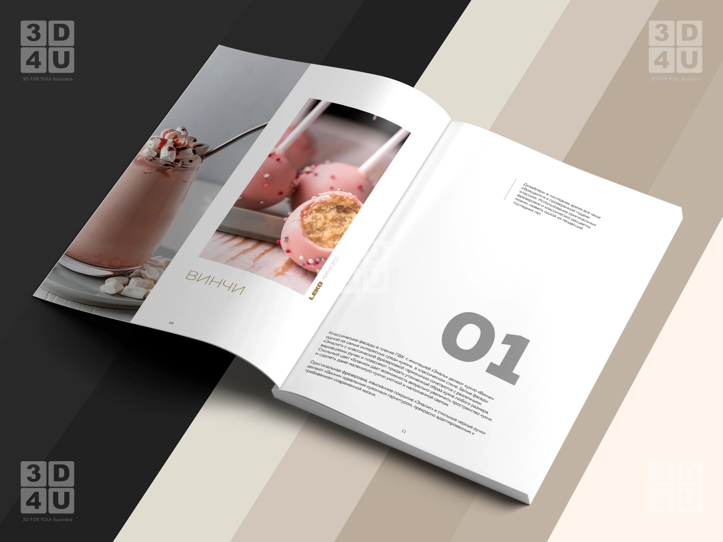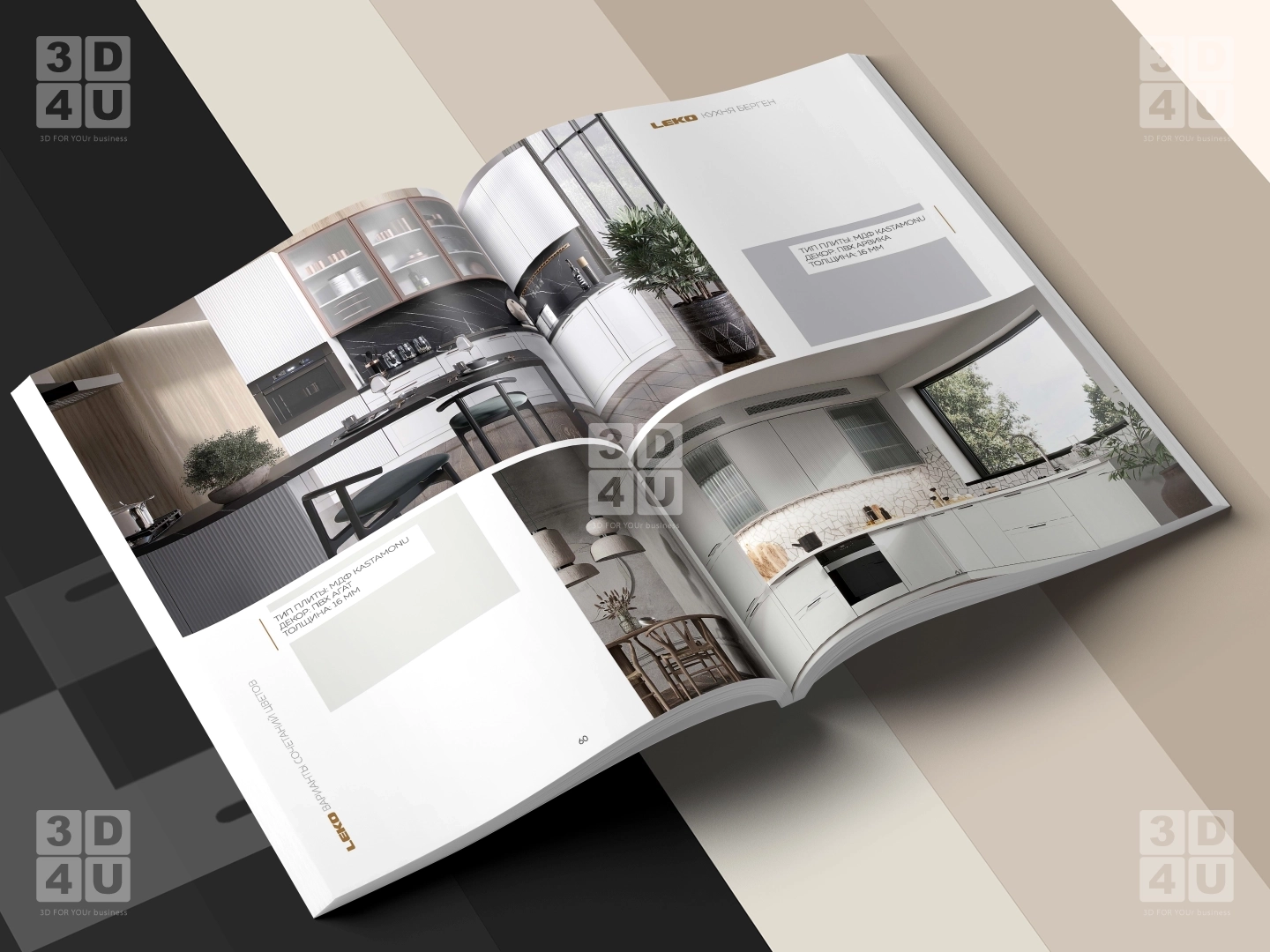 В каталоге представлены четыре коллекции модульных кухонь. Каждая из них продемонстрирована в нескольких рендерах, включая макро-кадры для более детального рассмотрения. Макро-кадры позволяют увидеть мельчайшие детали каждой кухни, такие как текстура фасадов, фурнитура и отделка. Это даёт возможность клиентам лучше представить, как будет выглядеть кухня в их доме. В последнем разделе каталога показана модульная система, которая является общей для всех представленных кухонь. Эта система позволяет легко комбинировать модули, создавая уникальный дизайн кухни.