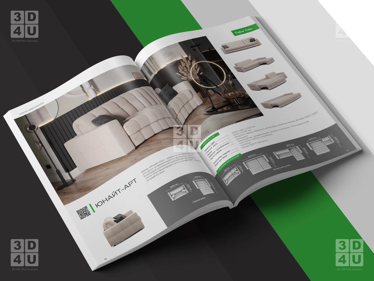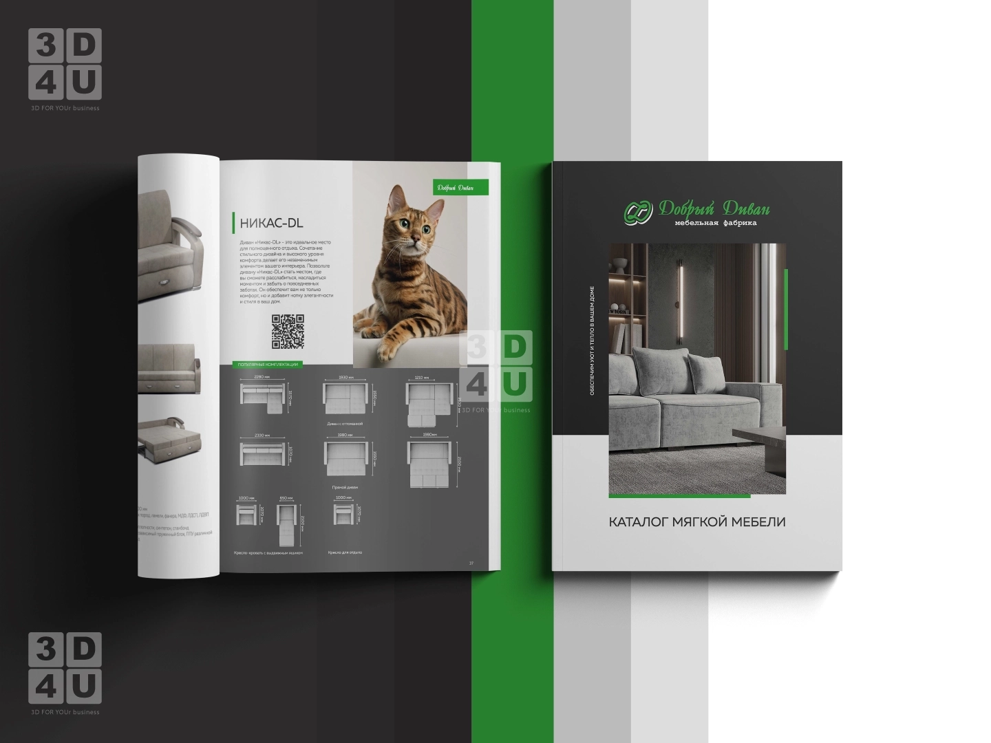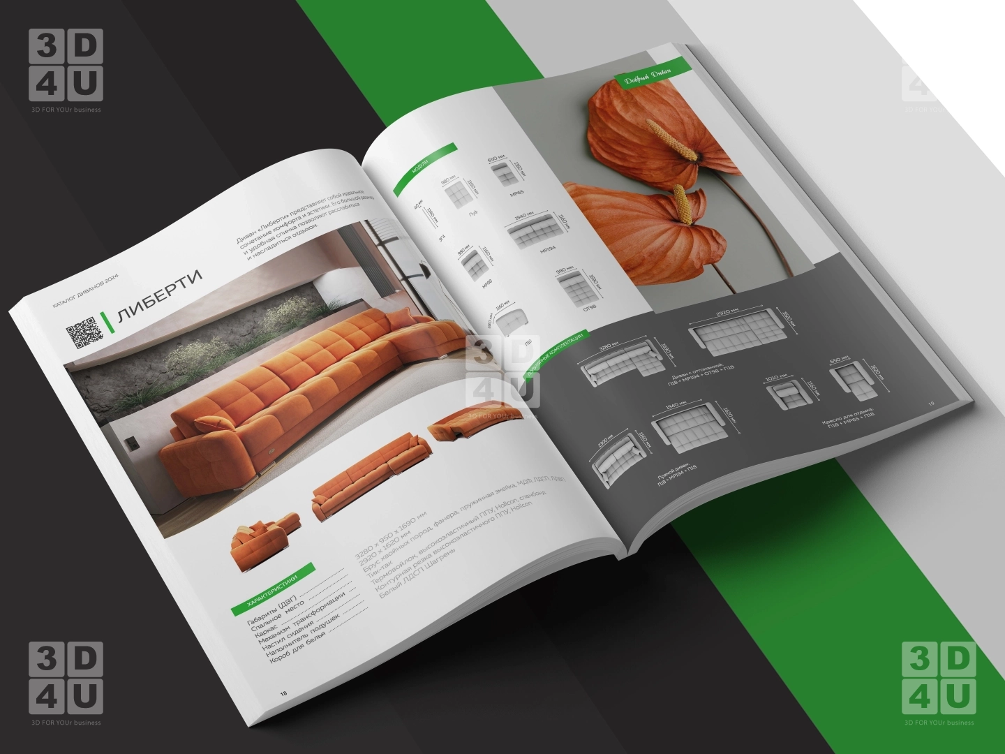 Мы разработали каталог мягкой мебели для компании «Добрый Диван». В каталоге сделаны несколько вариантов разворотов, подходящих под конкретную модель дивана. Все ренедеры и схемы были выполнены нашей студией. Для каждого дивана сгенерирован QR-код, ведущий на нужный раздел сайта.