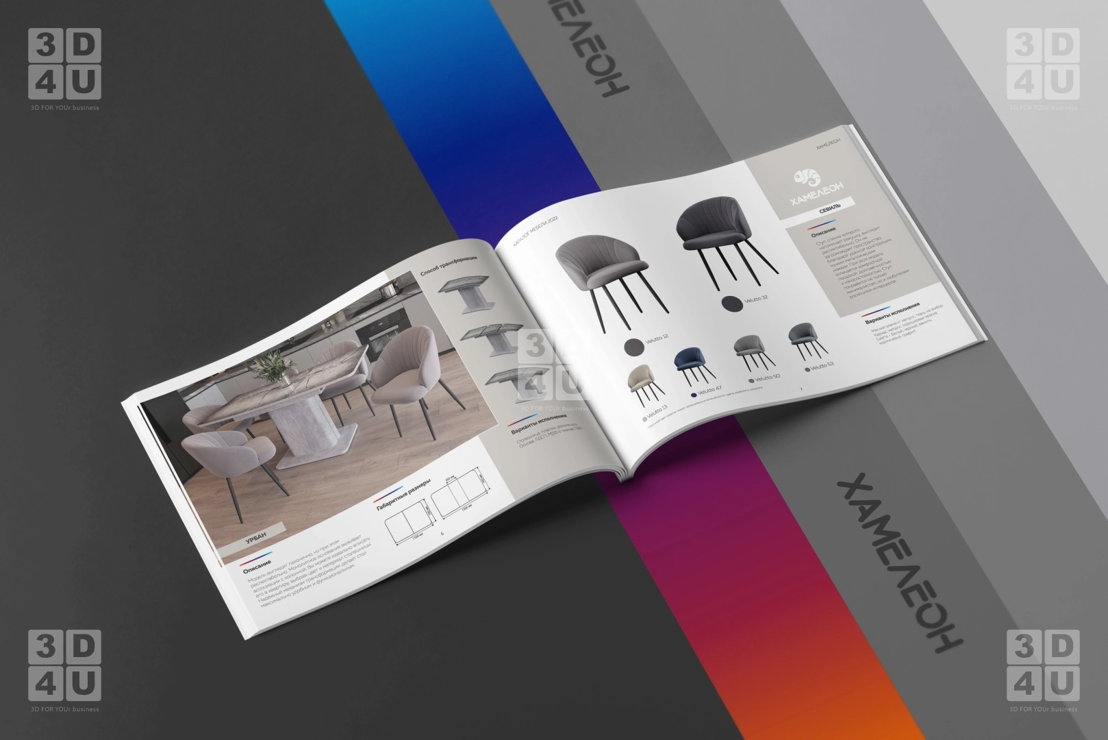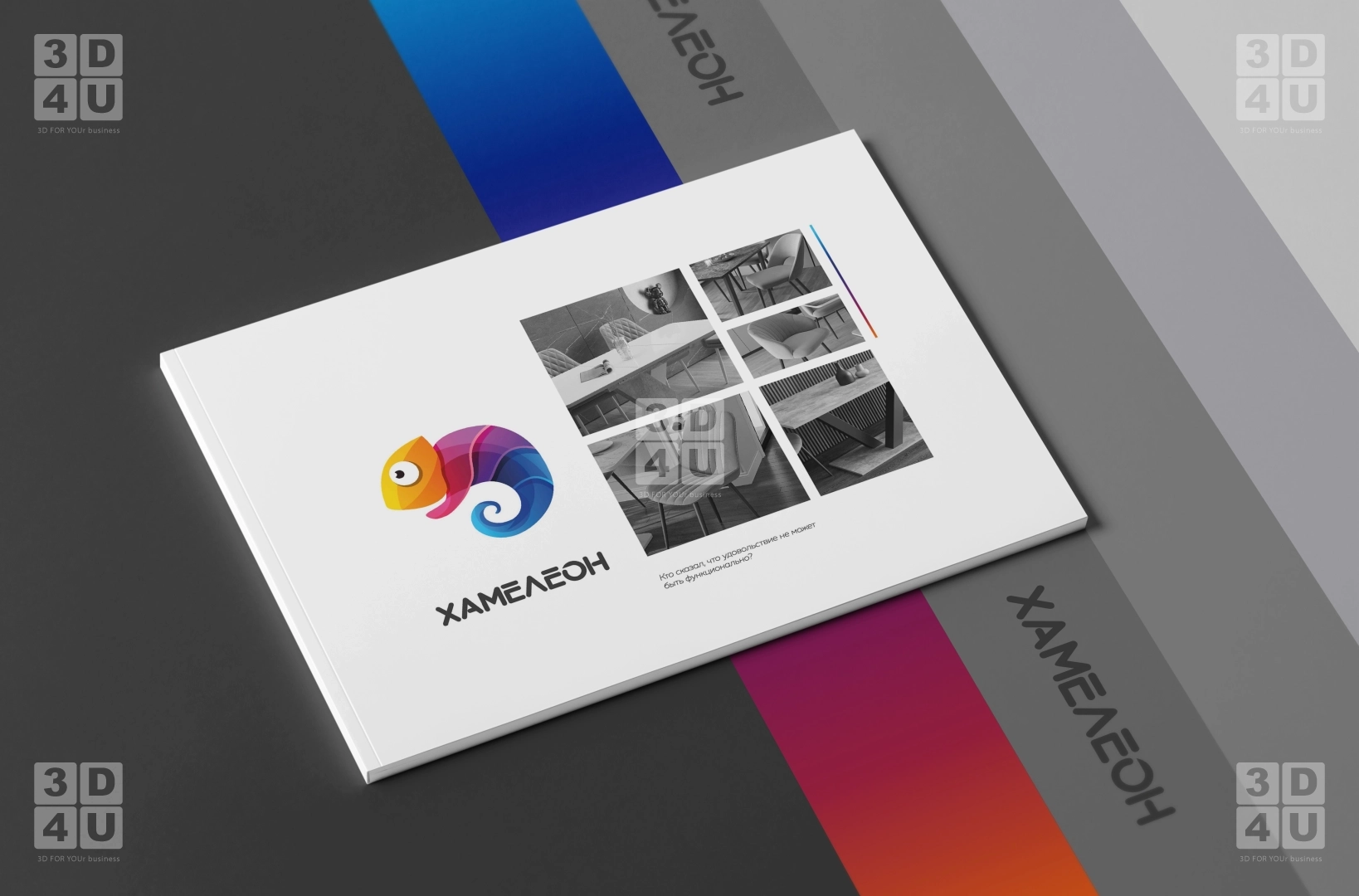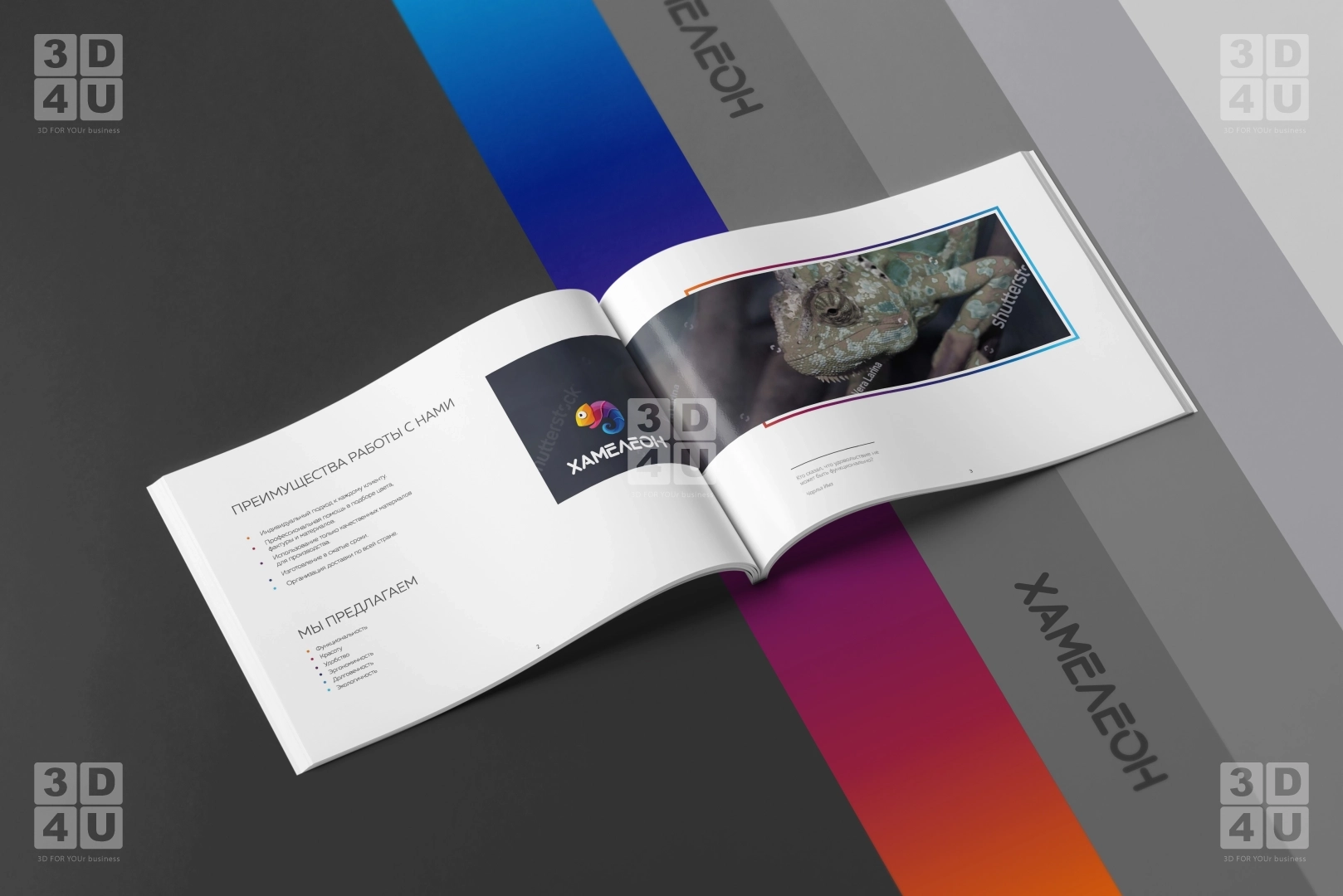 Яркий каталог в альбомной ориентации для компании «Хамелеон». Компания обновила свой логитип, и мы сделали каталог с использованием новых фирменных цветов, с декоративной градиентной линией, повторяющей цвета хамелеона в логотипе.