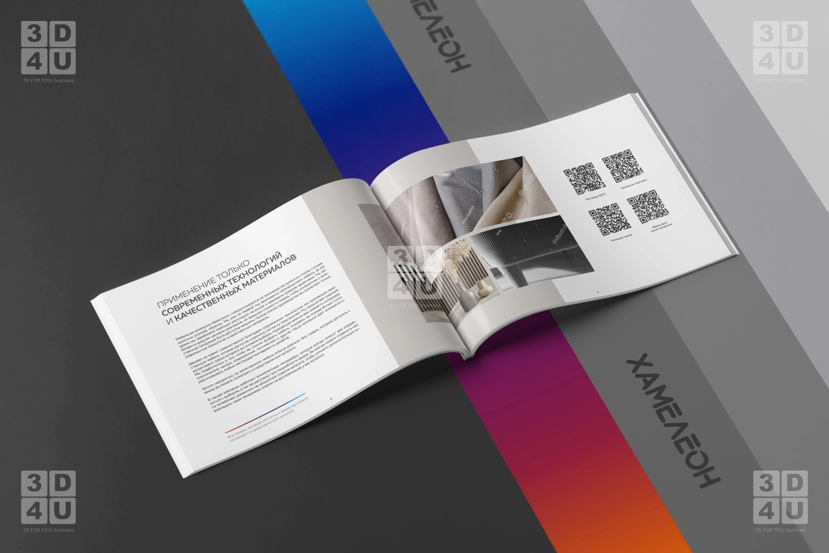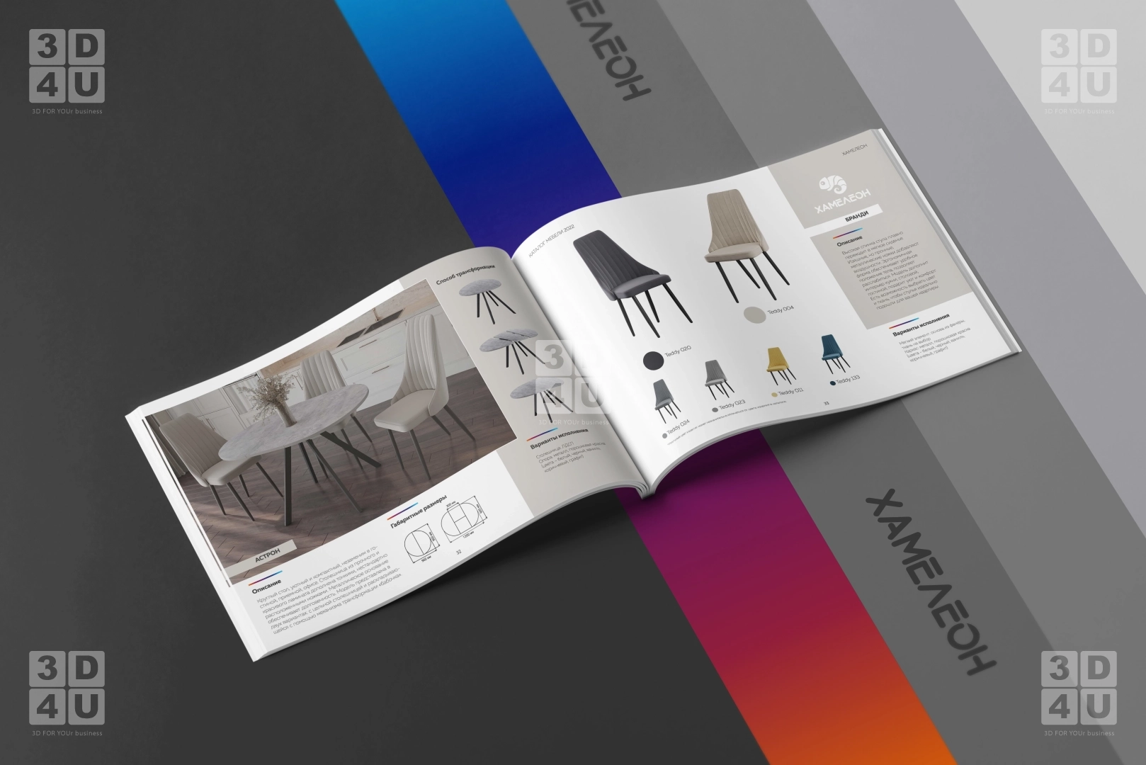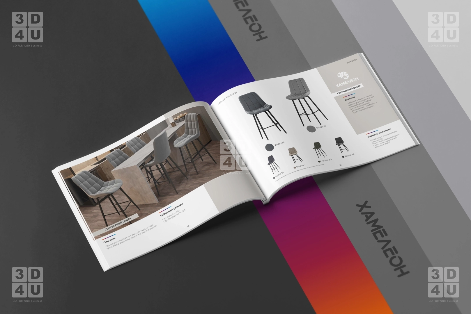 Яркий каталог в альбомной ориентации для компании «Хамелеон». Компания обновила свой логитип, и мы сделали каталог с использованием новых фирменных цветов, с декоративной градиентной линией, повторяющей цвета хамелеона в логотипе.