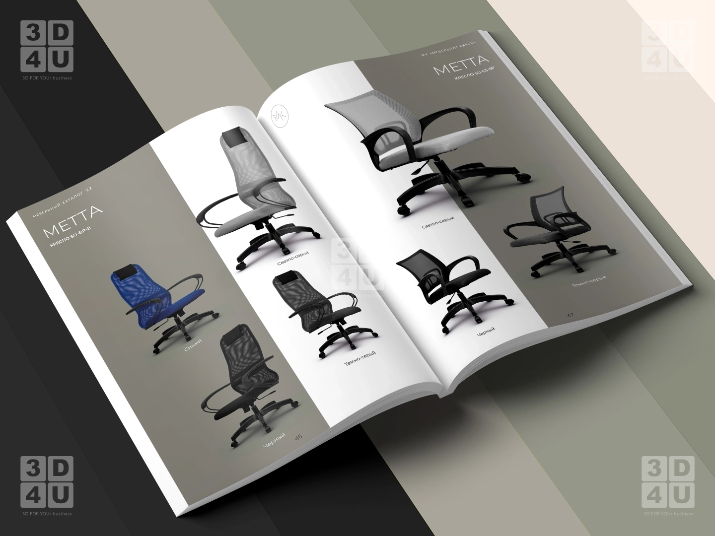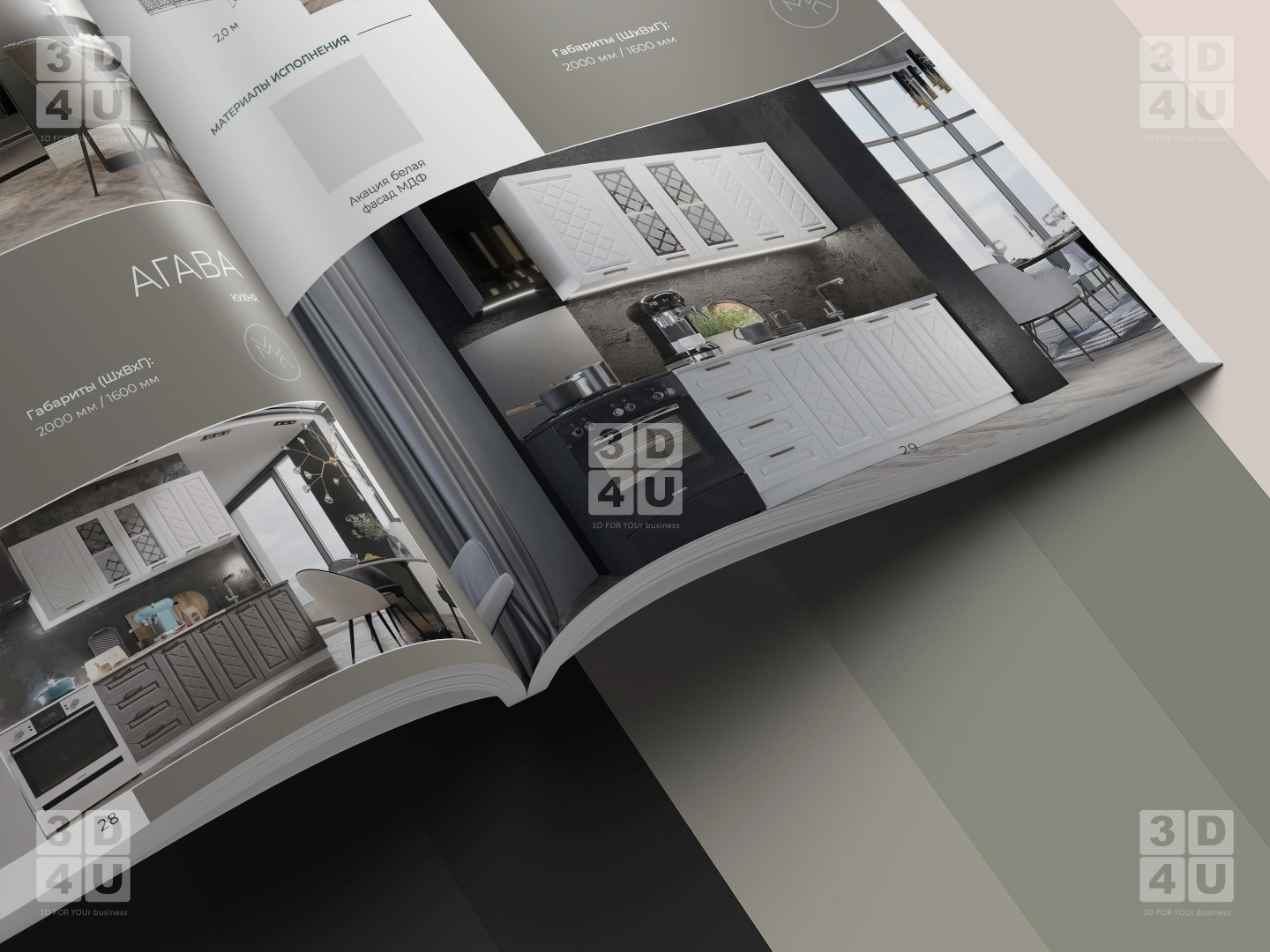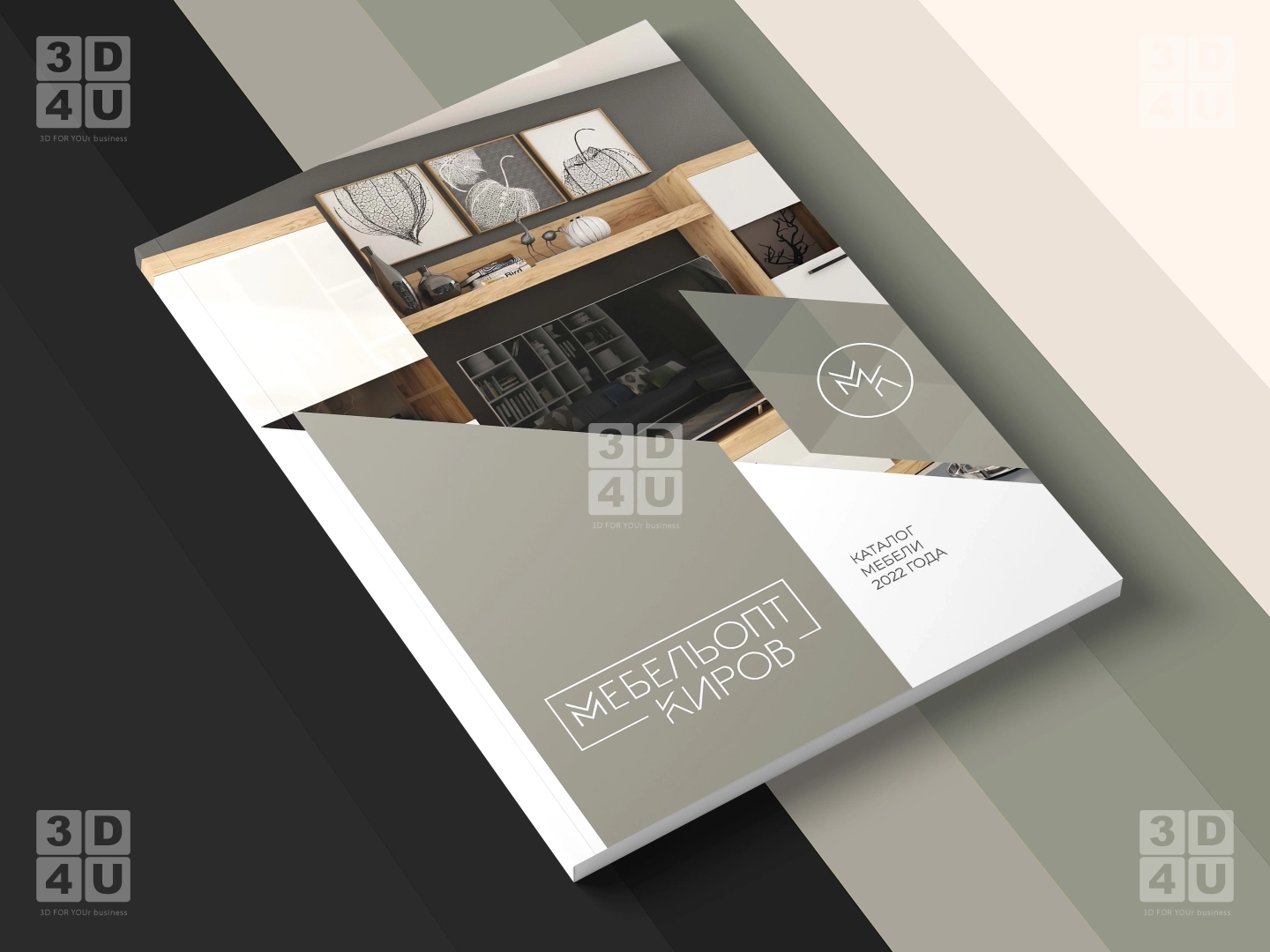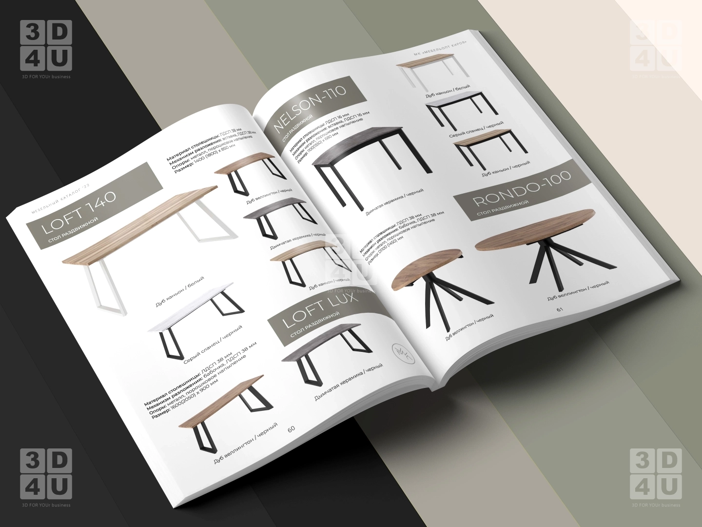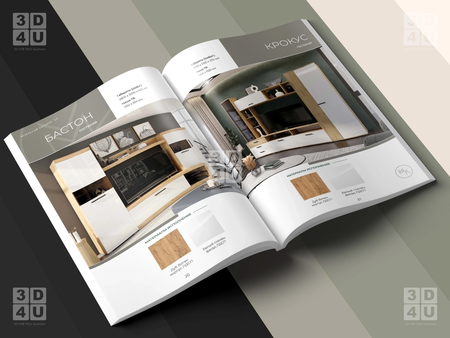 Дизайн и верстка полного каталога продукции для «МебельОптКиров». Развороты каталога различаются в зависимости от группы мебели - гостиные, кухни, столы, стулья и другое.