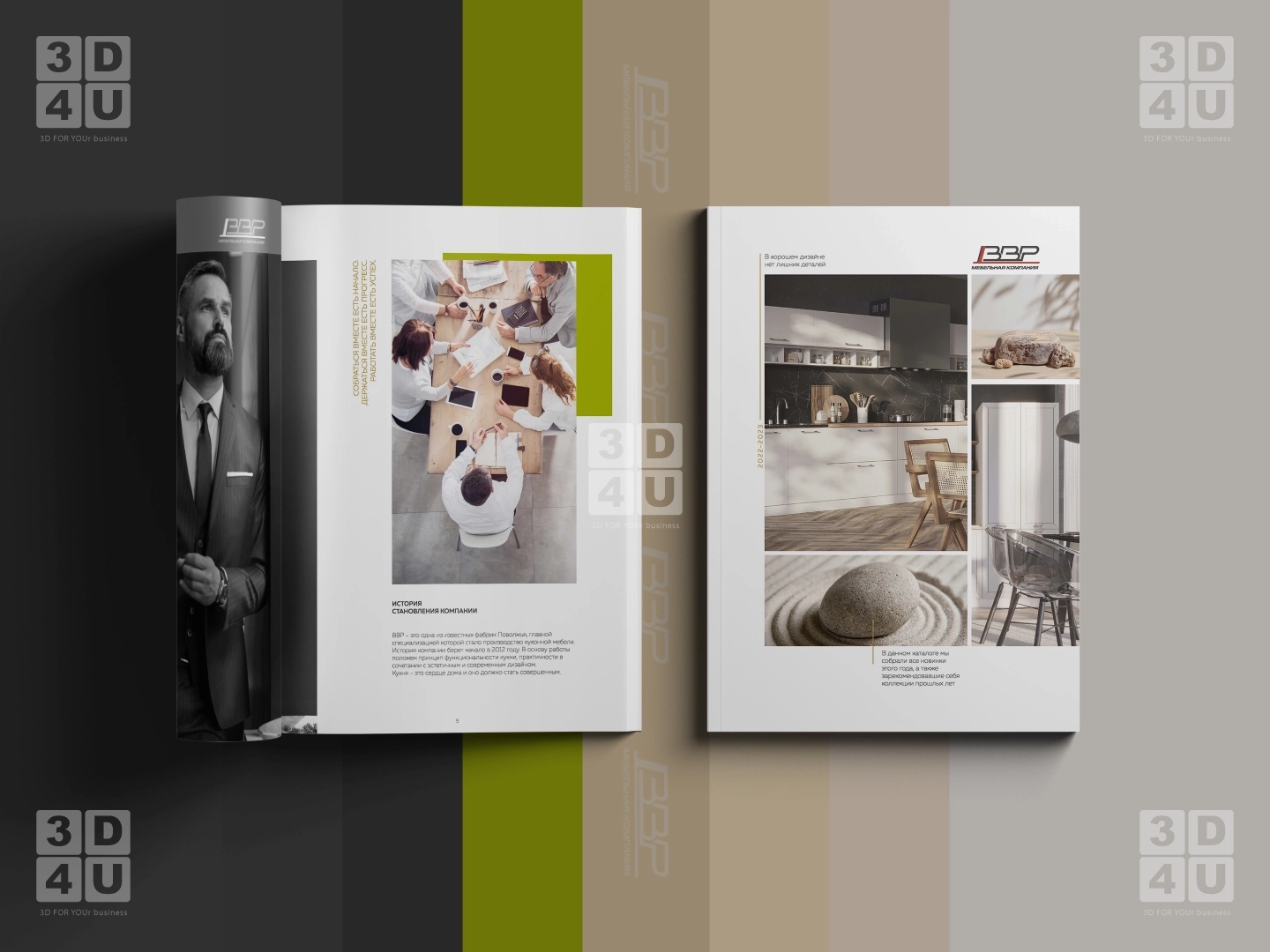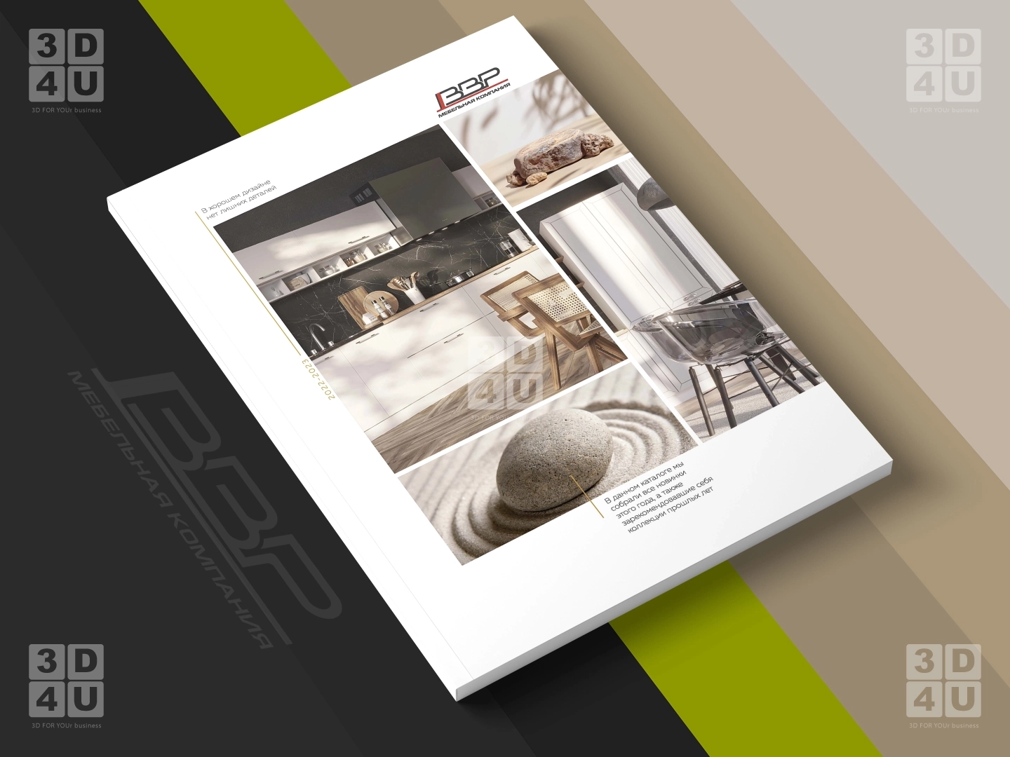 В качестве основной палитры каталога использован графитовый и бежевый цвет, акцентные цвета - салатовый и золотой.