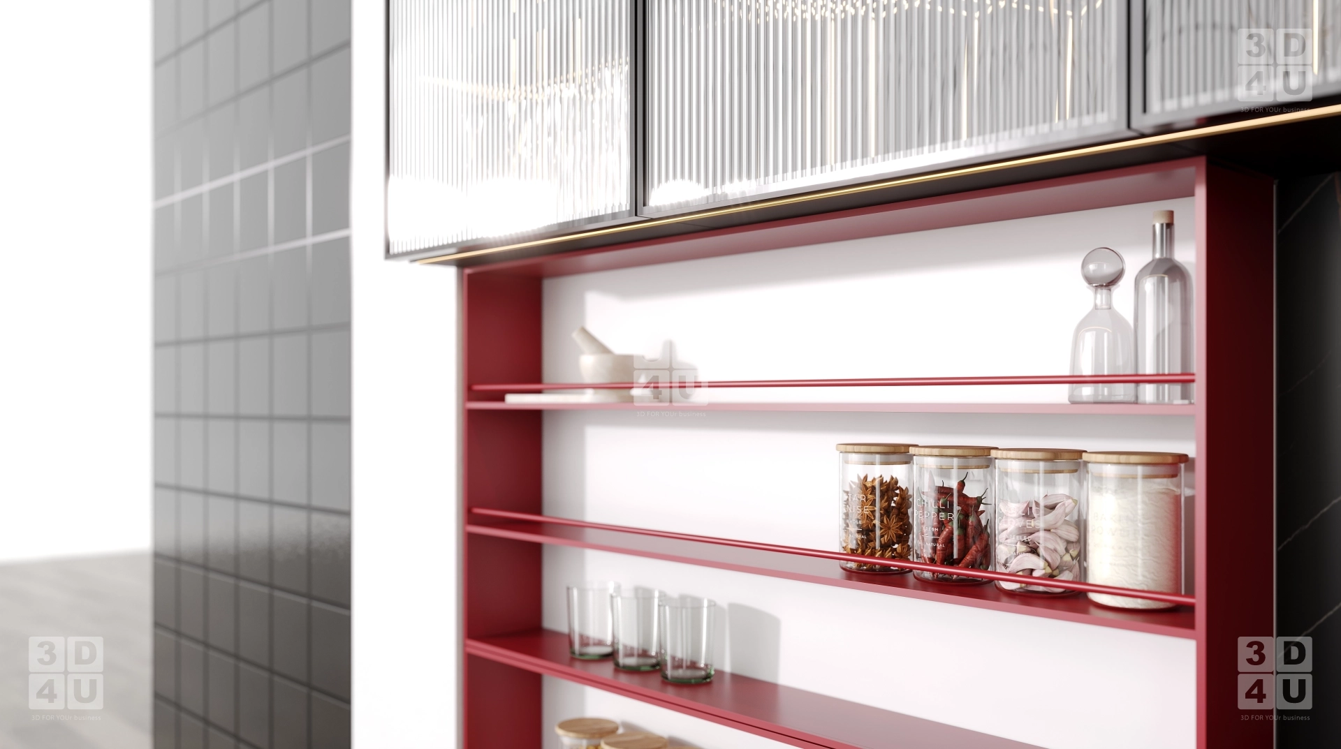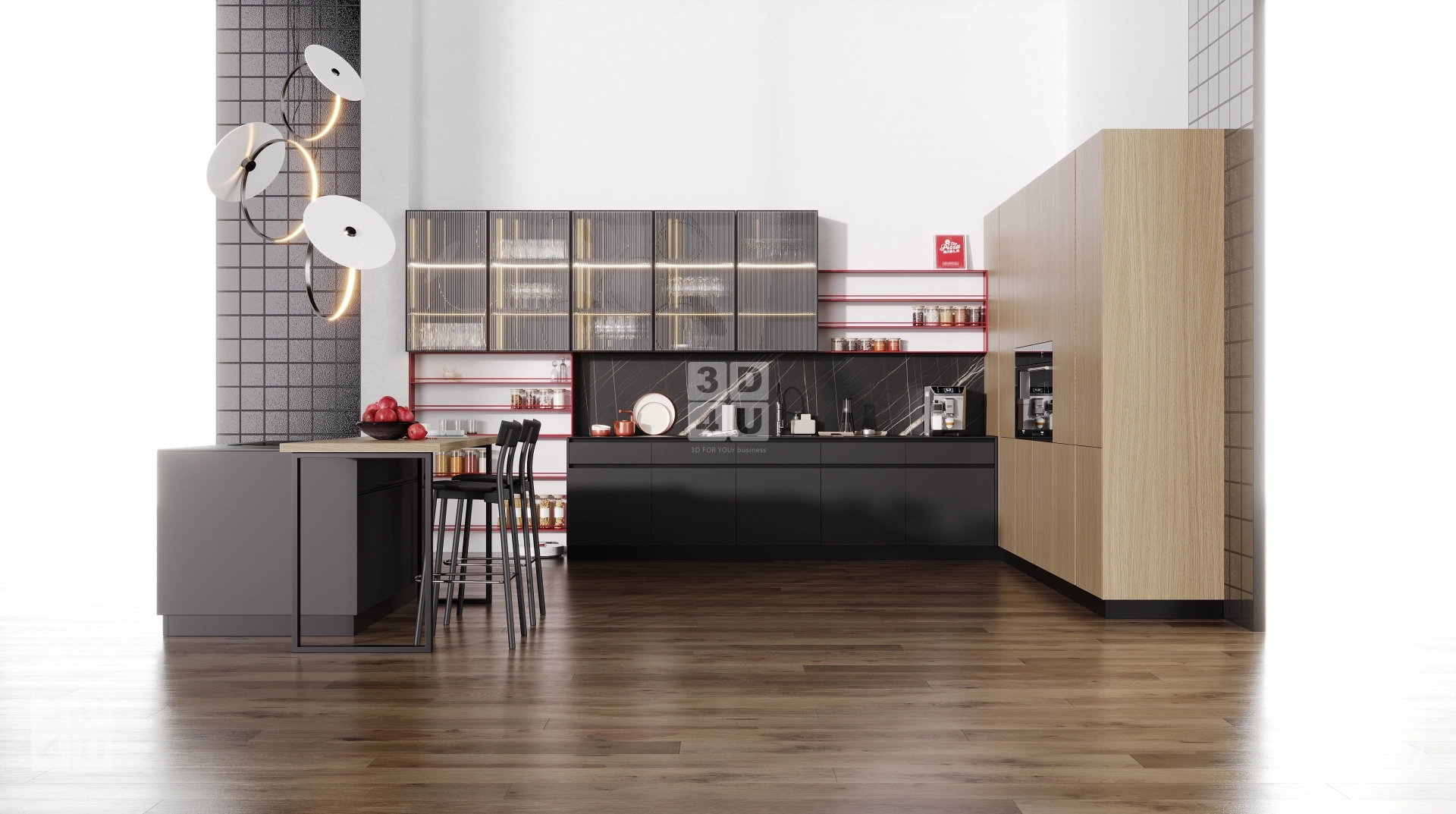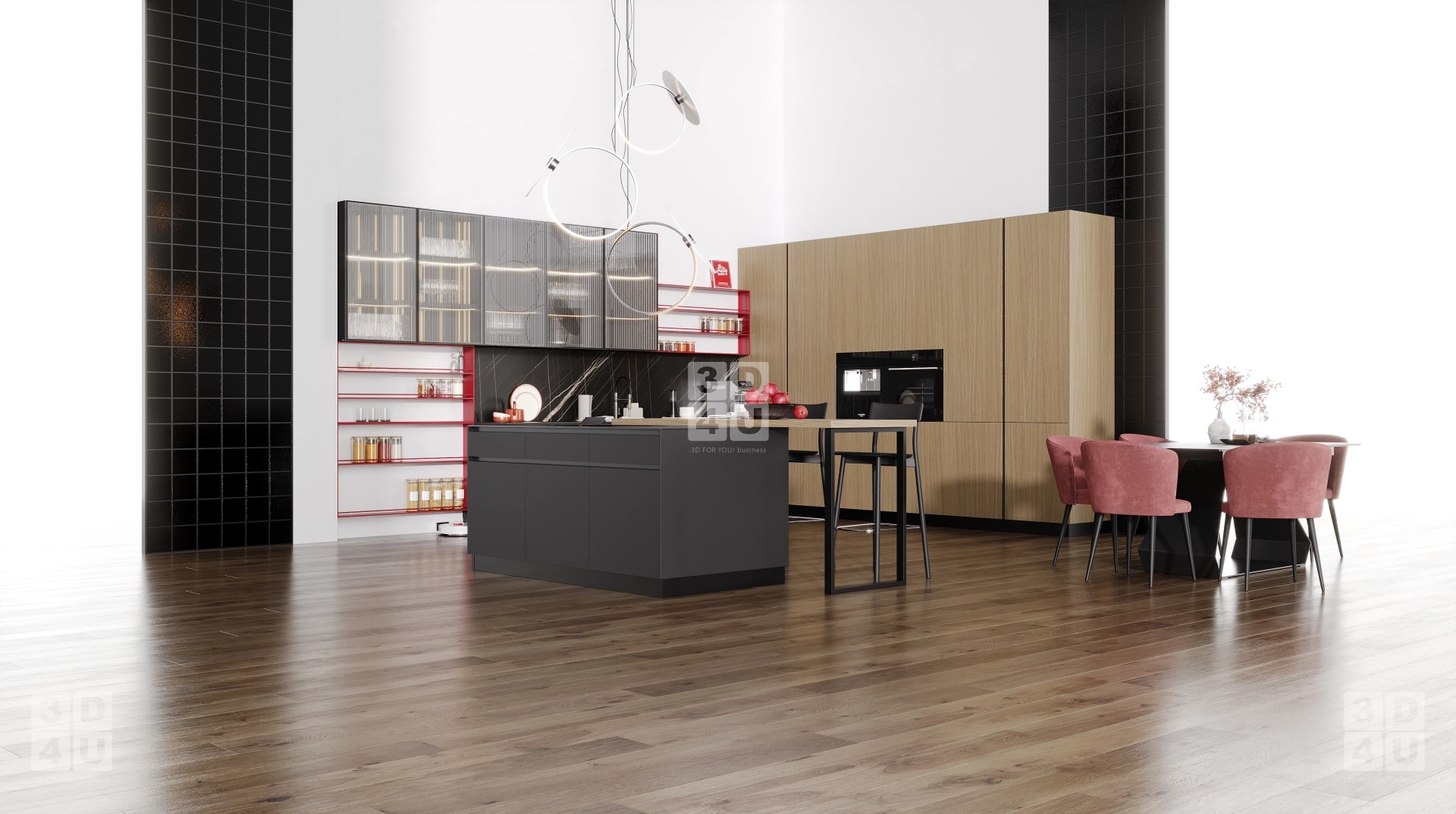 Погружайтесь в мир современного дизайна вместе с кухней «Скарлетта», которую мы визуализировали с особым вниманием к каждой детали. Сдержанные графитовые фасады и теплые деревянные текстуры формируют элегантную и благородную основу интерьера. Застекленные витрины верхних модулей добавляют пространству воздушности и изысканности, открывая взгляду изысканное наполнение шкафов. Динамичные красные полки для специй играют роль ярких акцентов, подчеркивающих индивидуальный характер кухни и привносящих эмоциональную насыщенность.