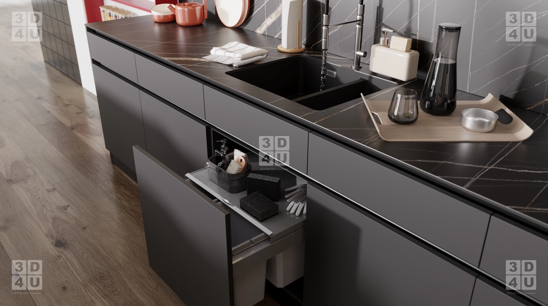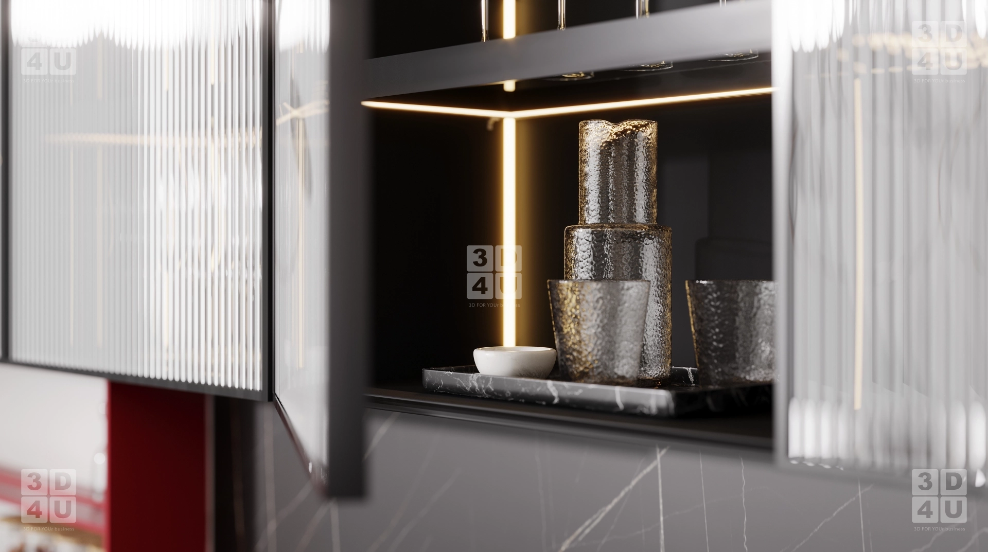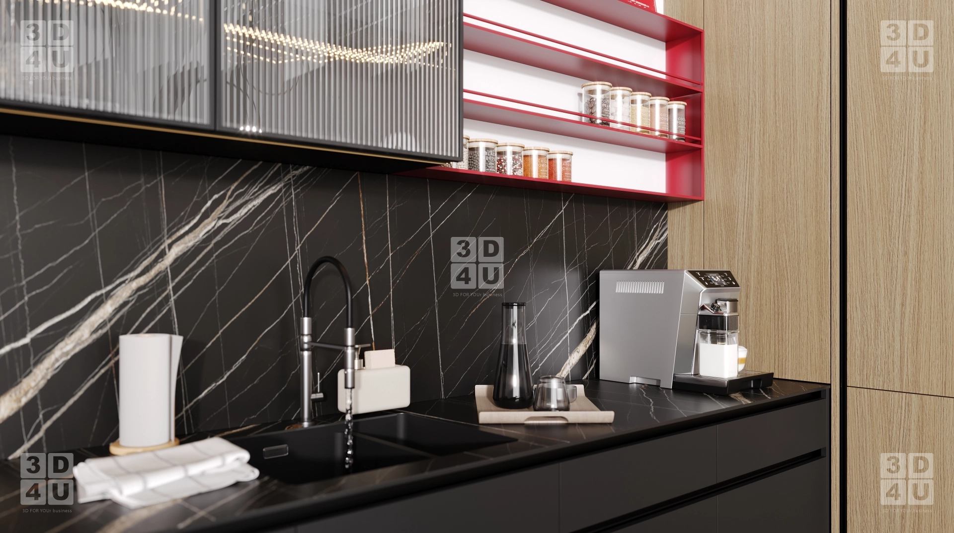 Погружайтесь в мир современного дизайна вместе с кухней «Скарлетта», которую мы визуализировали с особым вниманием к каждой детали. Сдержанные графитовые фасады и теплые деревянные текстуры формируют элегантную и благородную основу интерьера. Застекленные витрины верхних модулей добавляют пространству воздушности и изысканности, открывая взгляду изысканное наполнение шкафов. Динамичные красные полки для специй играют роль ярких акцентов, подчеркивающих индивидуальный характер кухни и привносящих эмоциональную насыщенность.