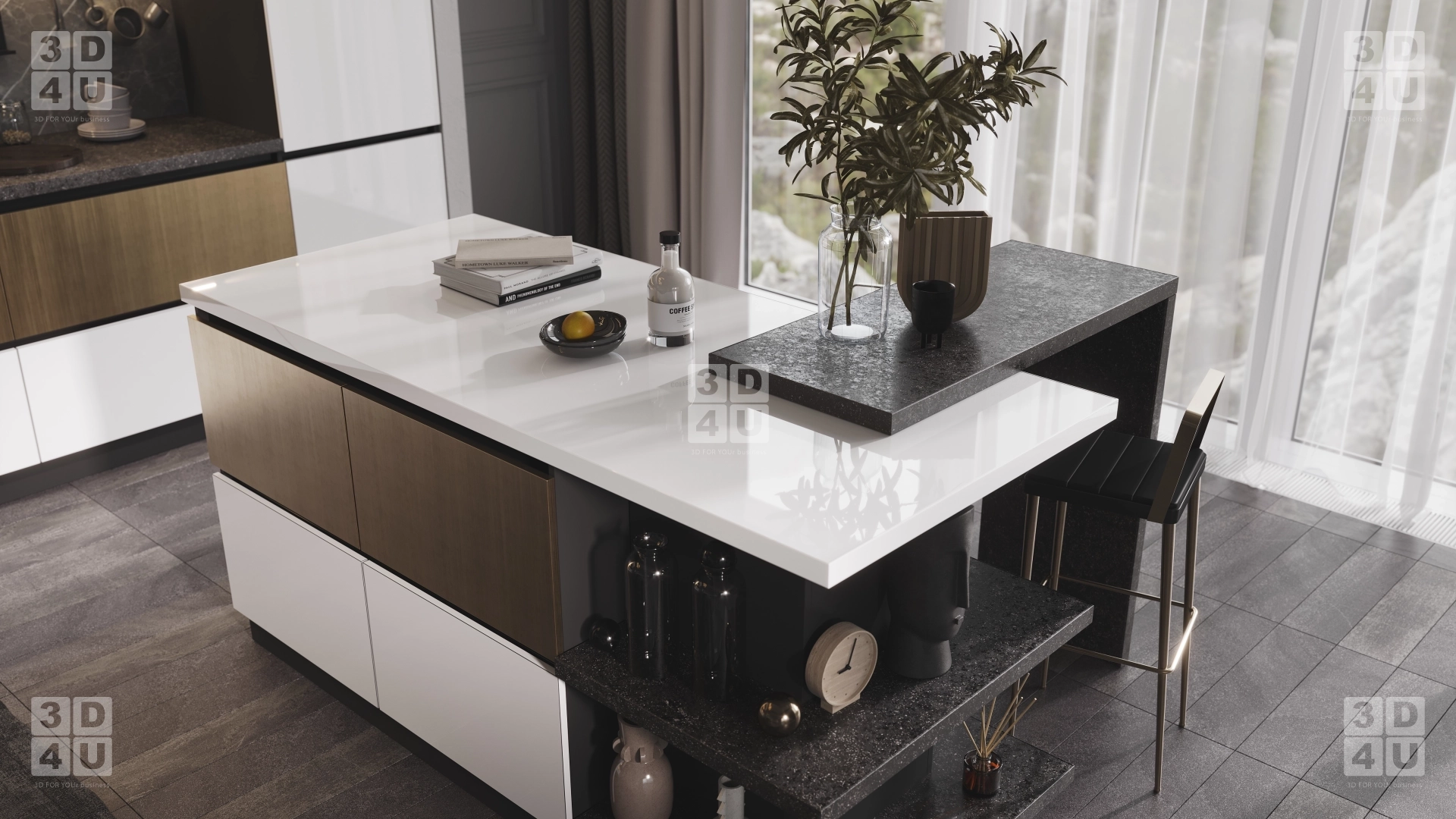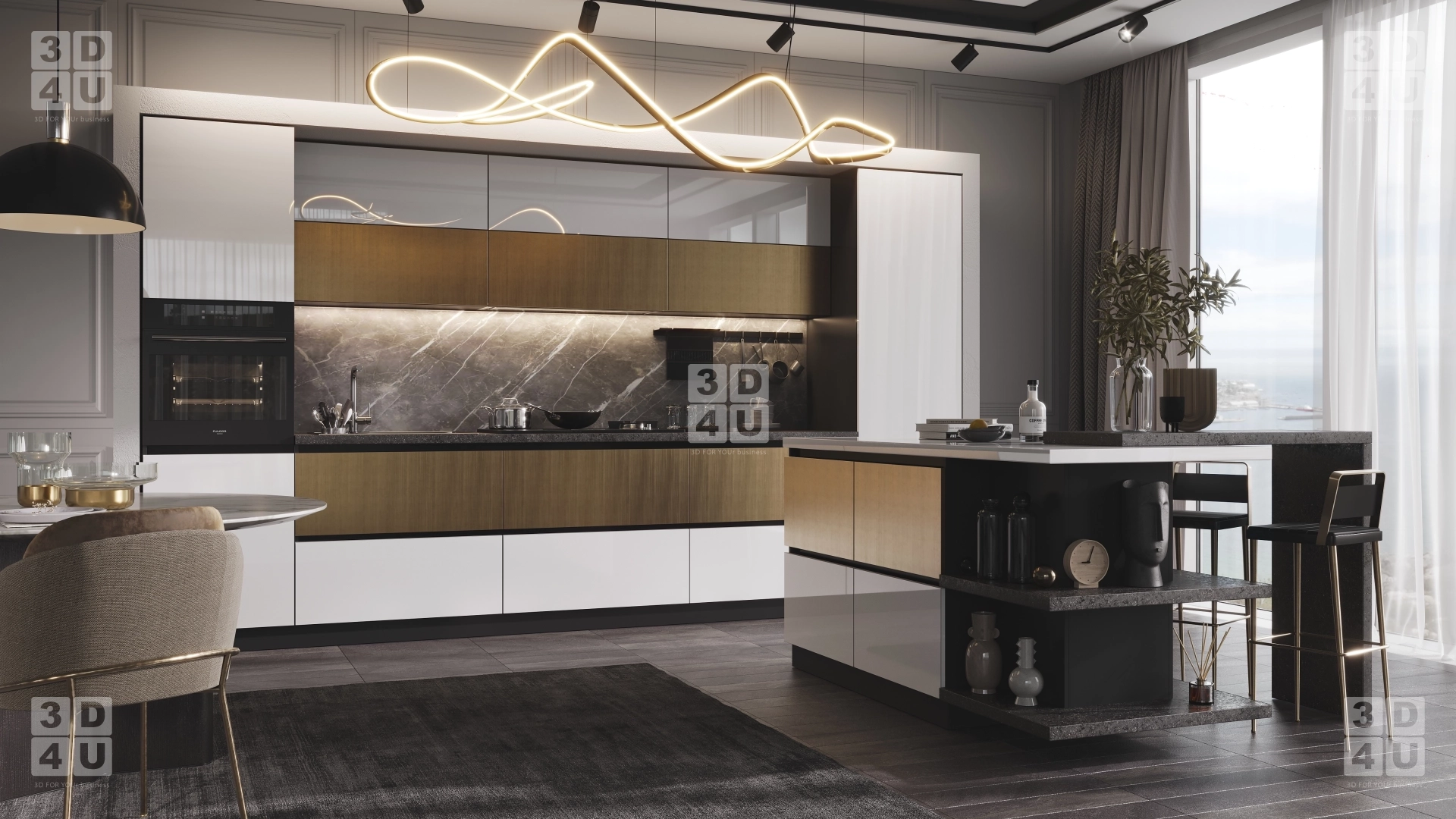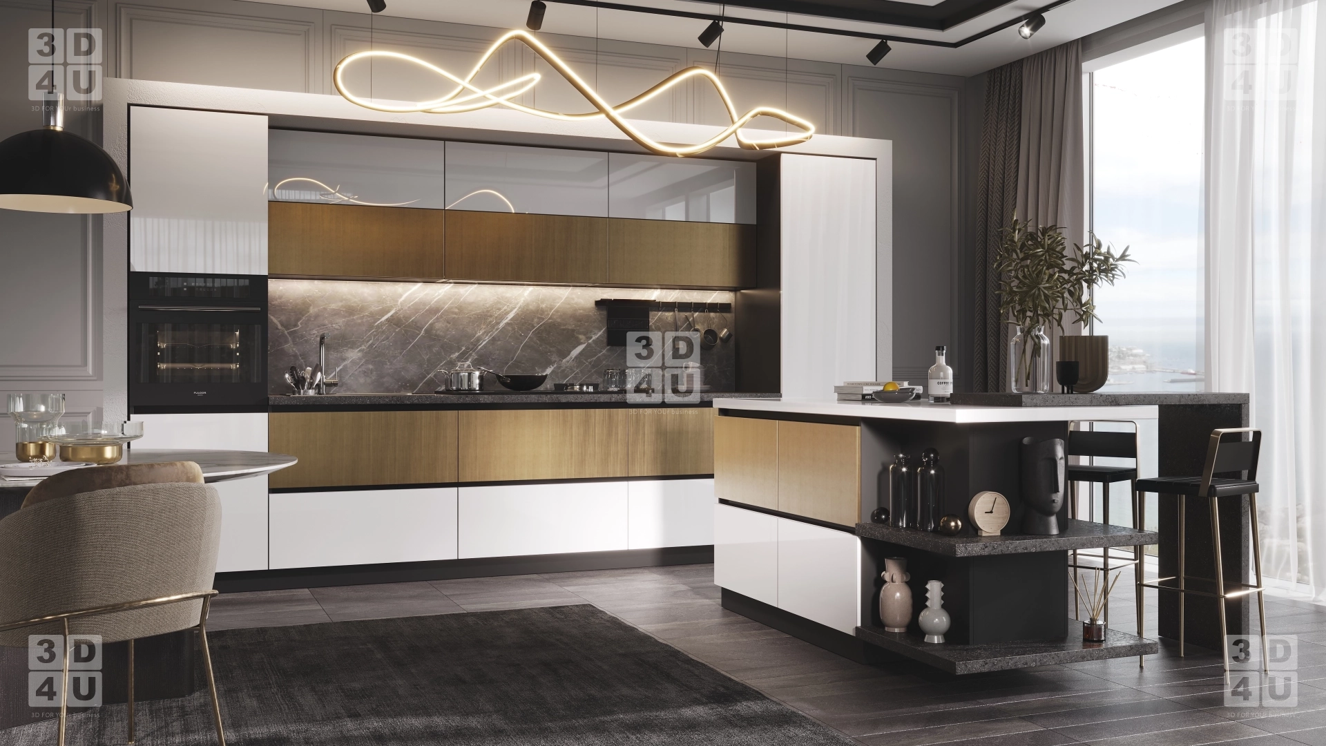 Стильная кухня с островом в визуализации для компании «Квартет».Кухня выполнена из комбинированных материалов МДФ AGT - Пикассо Голд и Белый, столешница - Черный Иней на основной кухне и Белый на острове. Контраст и яркость фасадам придает черная ручка-профиль. Золотые элементы продолжаются и в интерьере - в основании кресел, посуде и фантазийной люстре. Остров кухни необычной формы, с функциональным углом и дополнительным элементом в виде барной стойки.