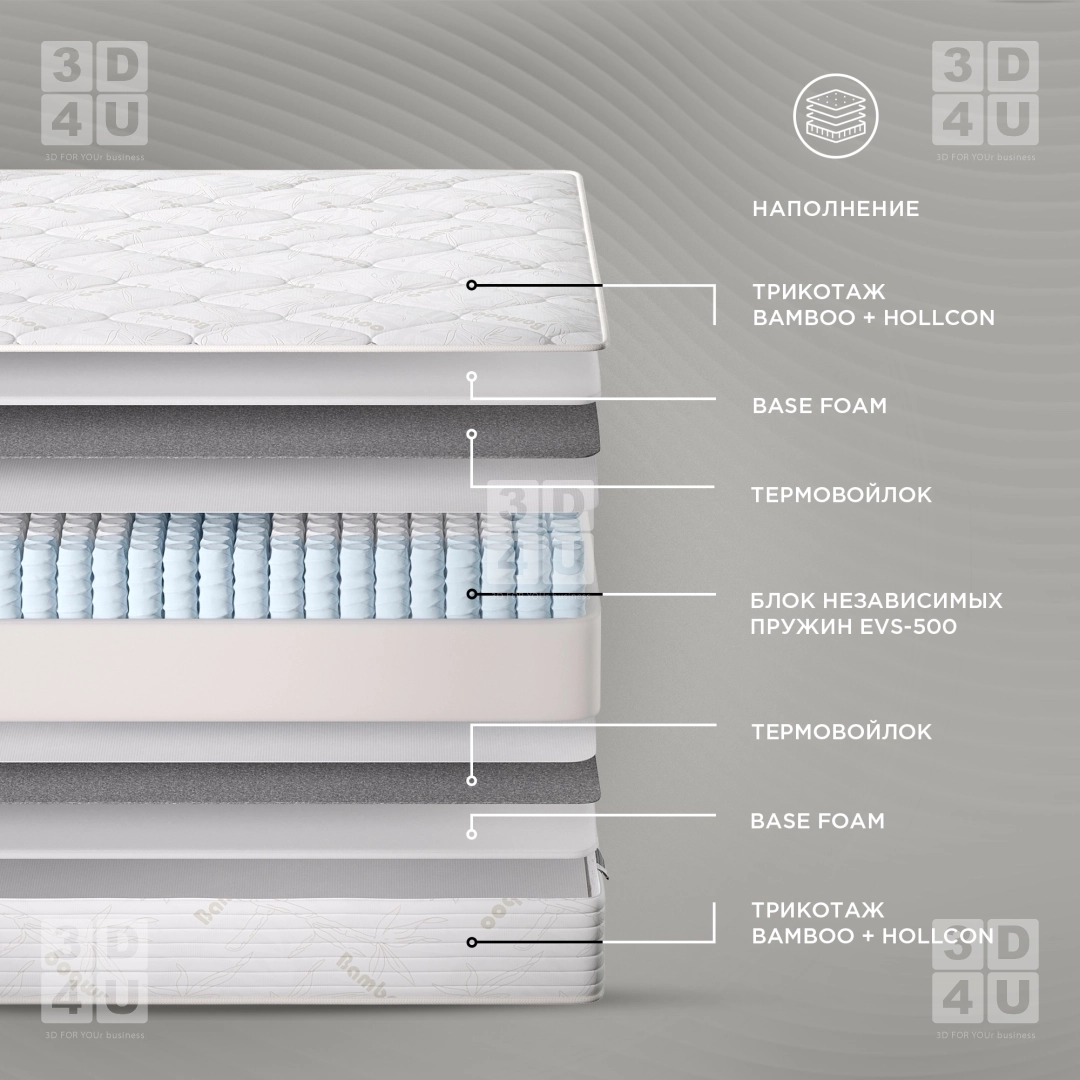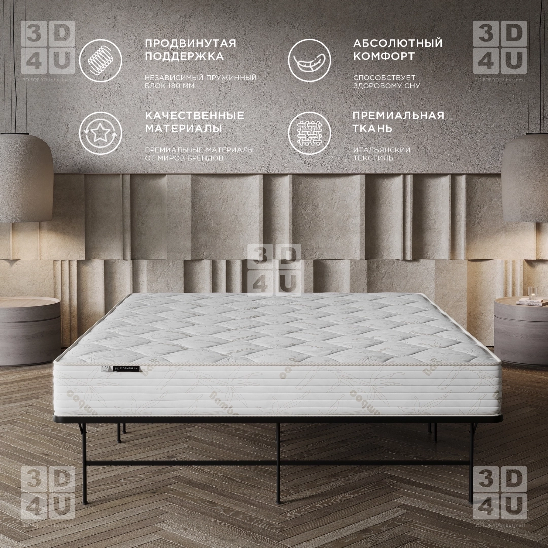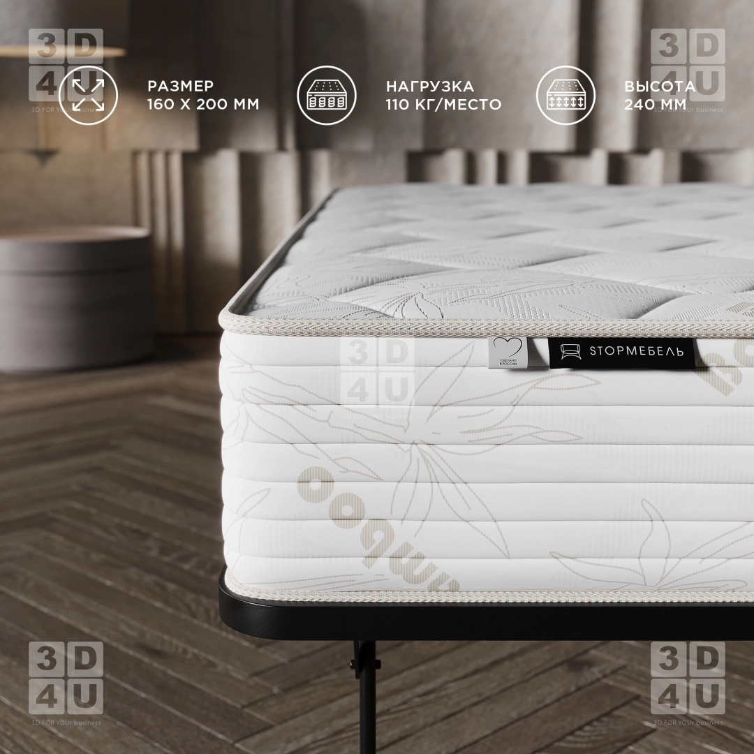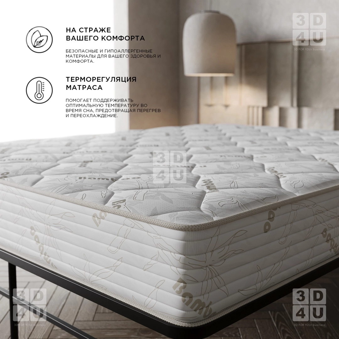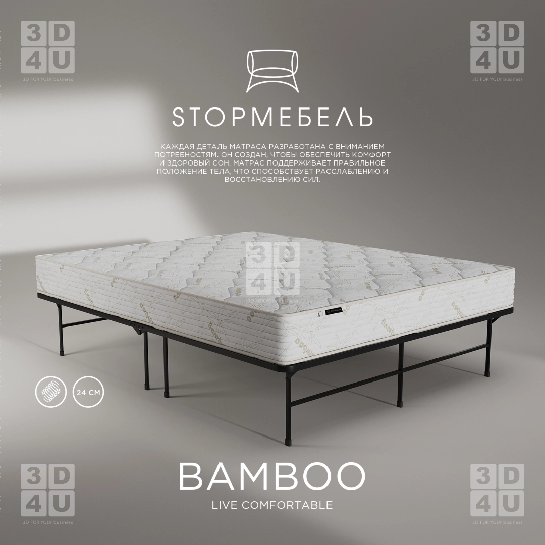 Карточки матраса «Bamboo» выполнены в минималистичном стиле для фабрики StopМебель. Основные особенности матраса акцентированы в макрокадрах.