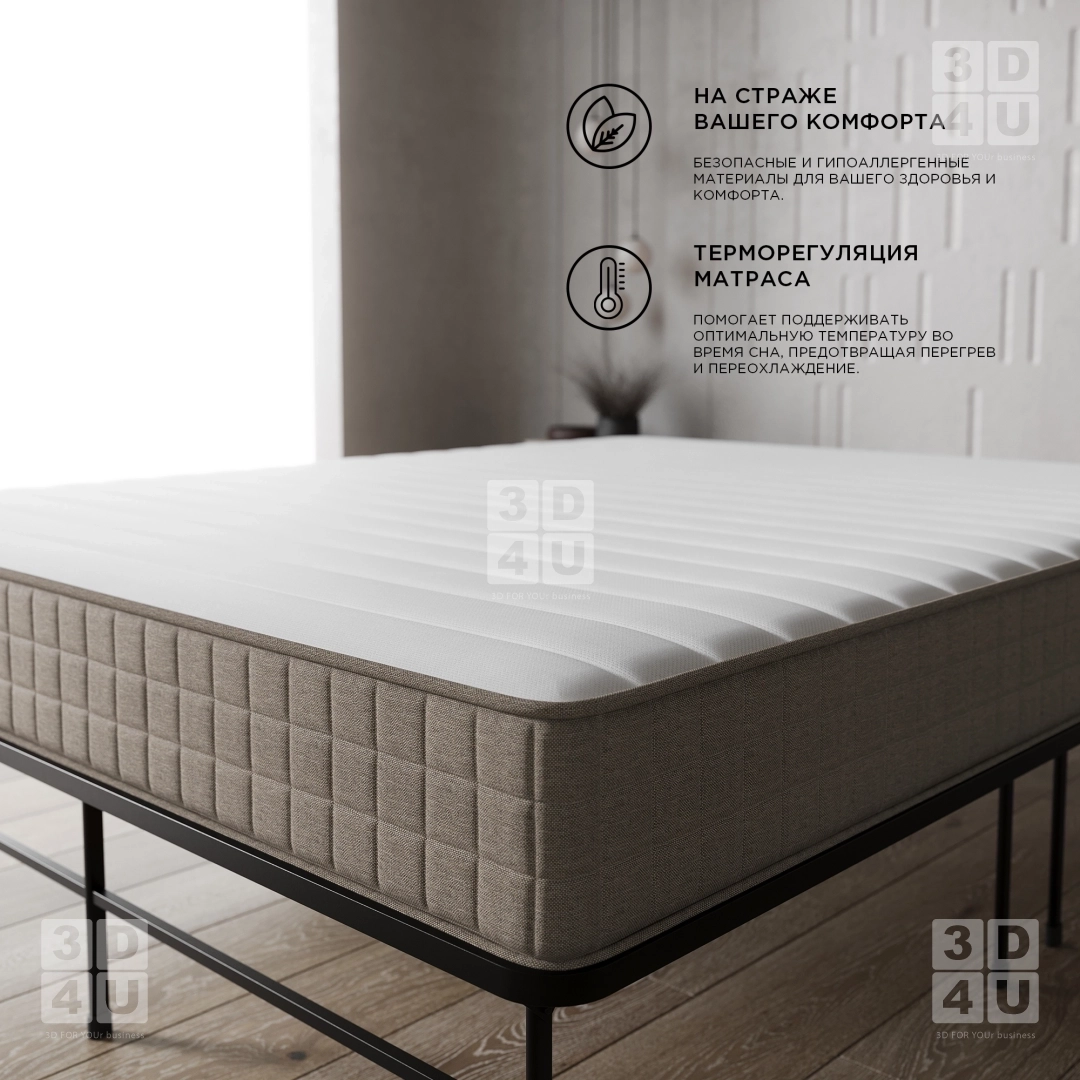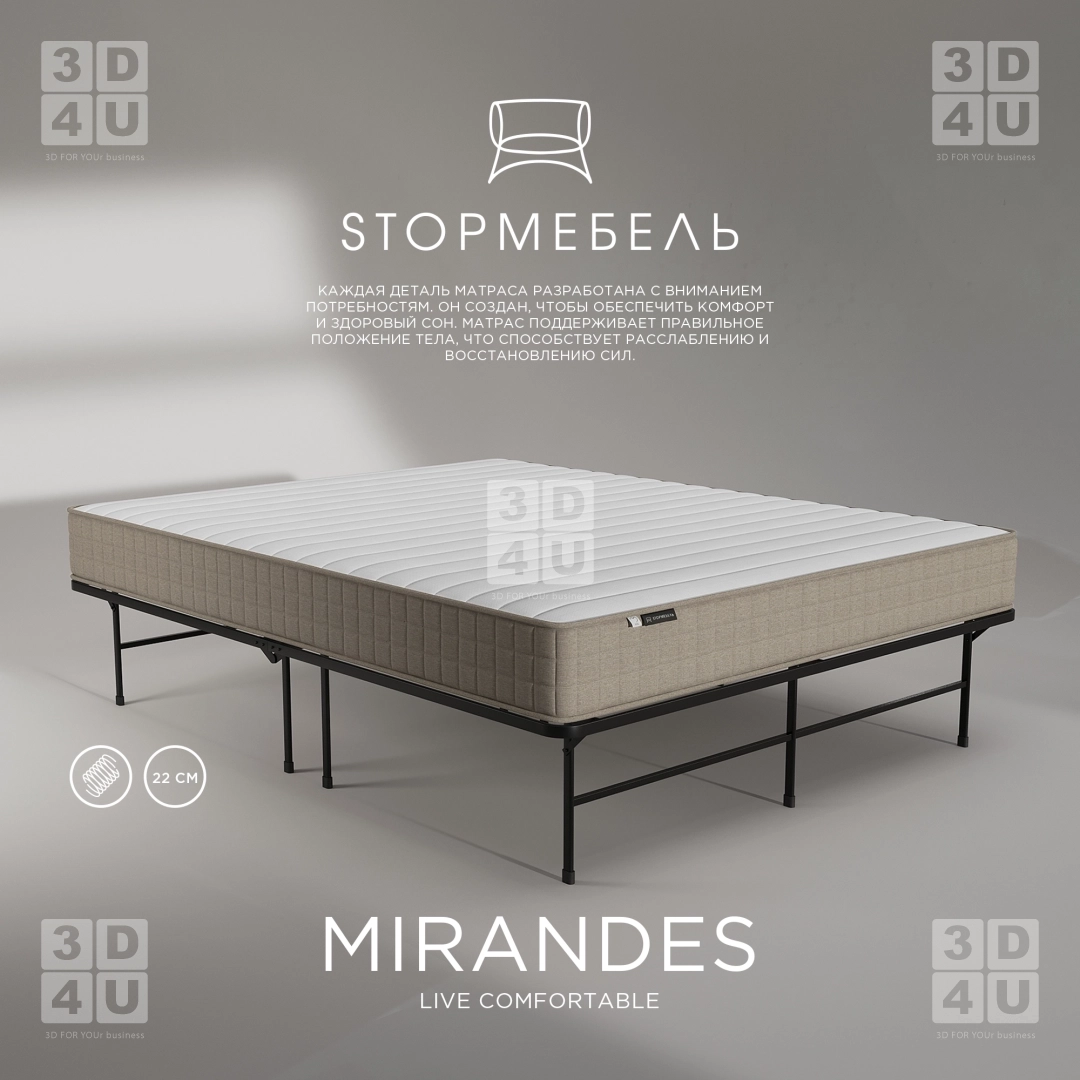 Для фабрики StopМебель созданы карточки матраса «Mirandes» в минималистичном стиле, где ключевые особенности изделия подчеркнуты в макрокадрах.