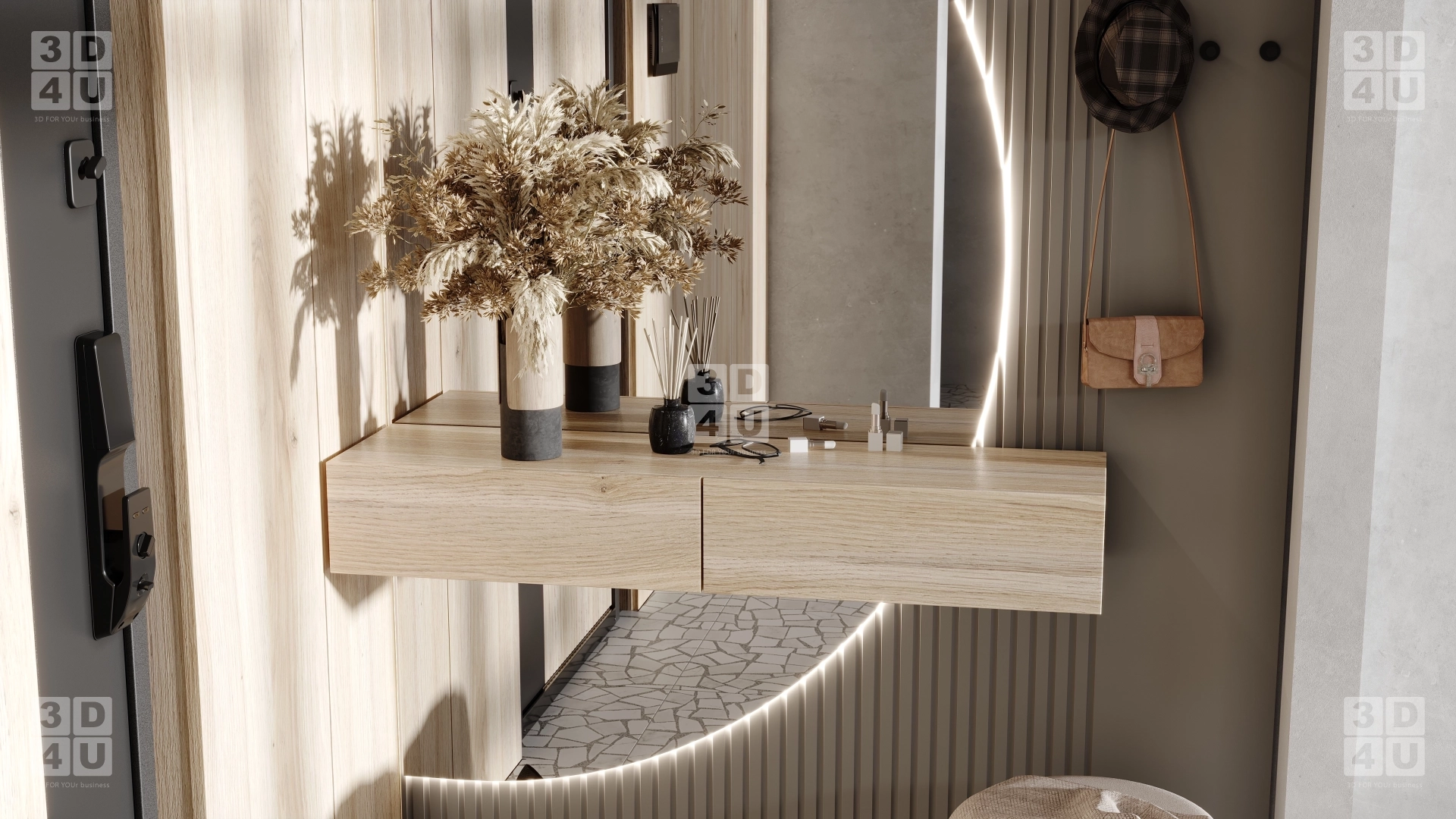 Уникальность прихожей в том, что это готовое решение для оформления входной зоны в современной эстетике. Это комбинация подвесной тумбы, декоративной панели с крючками и зеркала с подсветкой. Панель выполнена из МДФ с фрезеровкой «Доротея-2». В интерьере использованы аналогичные цвета и вертикальные линии, продолжающие дизайн прихожей. Сделано два рендера - общий вид и макро-кадр с акцентом на тумбу. Эти изображения вошли в каталог прихожих.