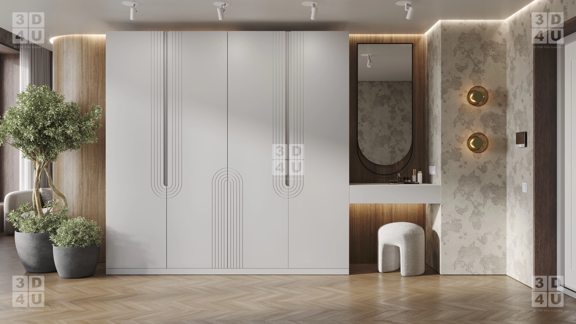 В гармонии с фрезеровкой выступают овальное зеркало и мягкий пуф. Вместе эти элементы создают атмосферу уюта и комфорта, которая так важна в прихожей.