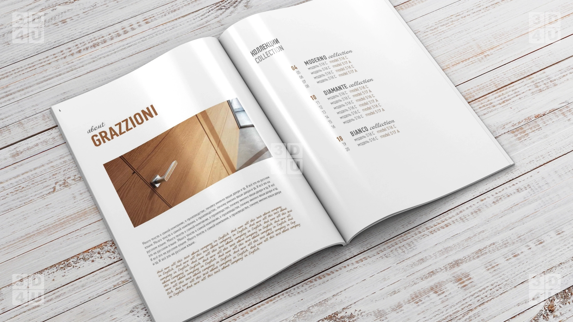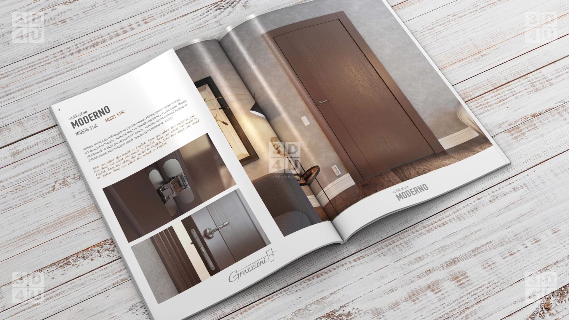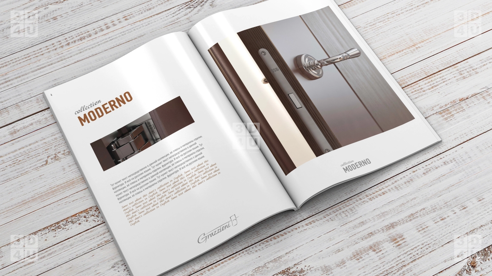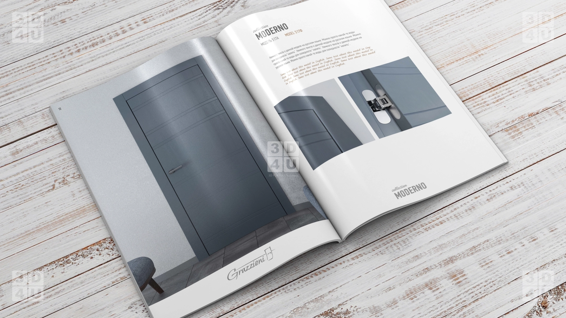 Верстка каталога для компании по производству межкомнатных дверей Grazionni на 3х языках: русском, английском и итальянском.