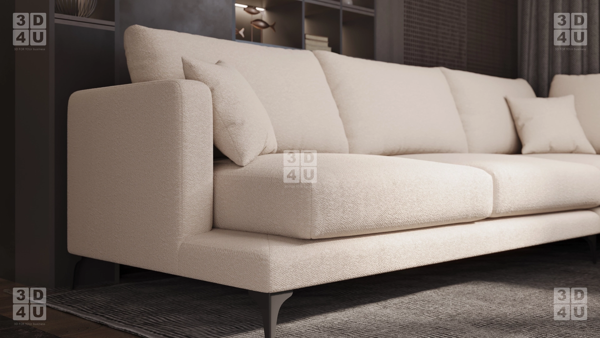 Диван нежнного кремового оттенка, с приятной на ощупь текстурной тканью. Простой, но изысканный дизайн подчеркивается аккуратными формами подушек и сиденья, которые кажутся такими мягкими и уютными. Изящные, тонкие, но прочные ножки добавляют легкости, в то время как две небольшие подушки незаметно дополняют образ дивана. Интерьер, в котором представлен диван, окутан атмосферой уюта и тепла. Он словно обнимает вас, приглашая отдохнуть после тяжелого дня. 3D визуализация позволяет оценить, как диван вписывается в пространство, создавая гармоничное сочетание с окружающей обстановкой. Это не просто фотография — это опыт, который позволяет вам представить, как этот диван будет выглядеть вживую в интерьере.